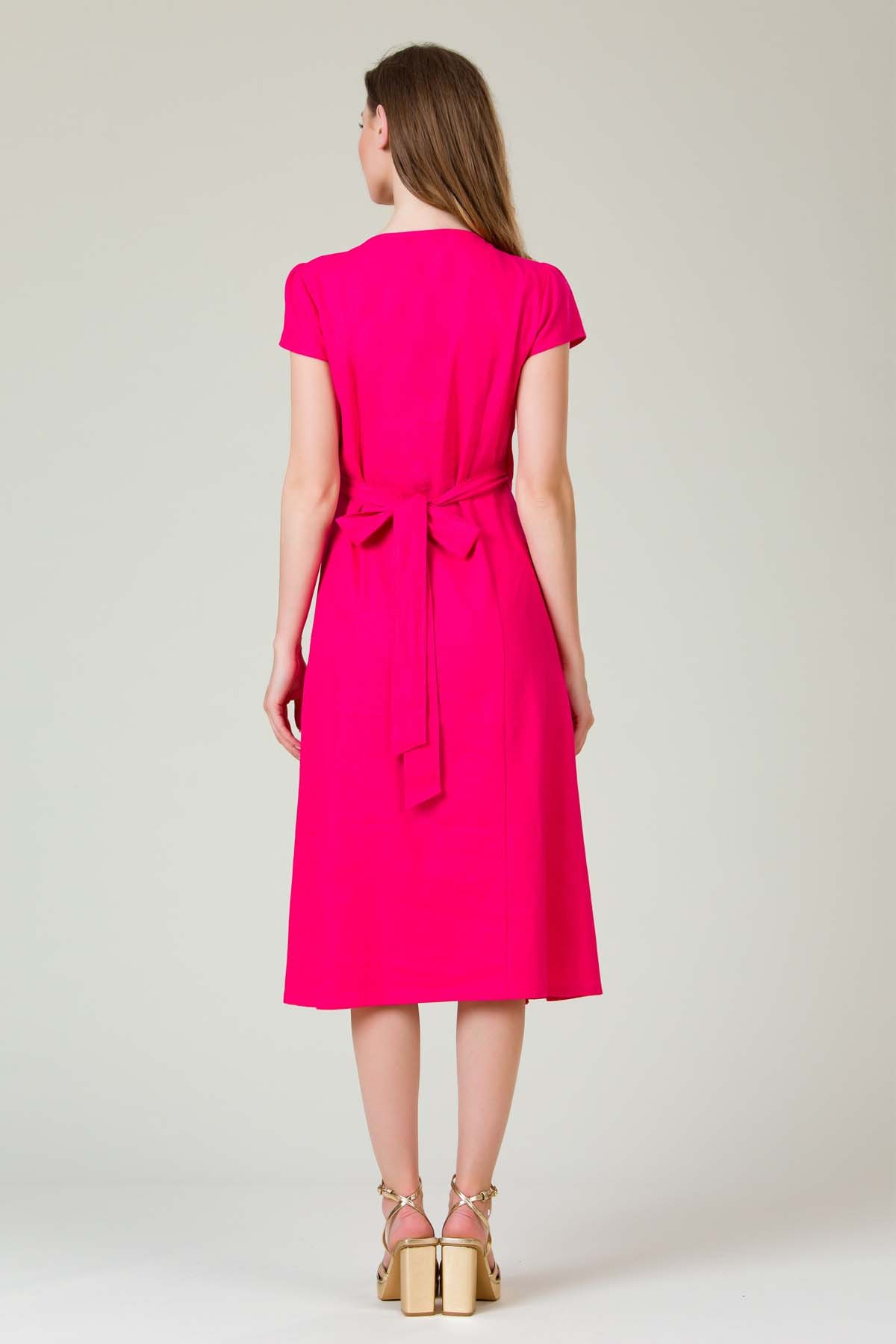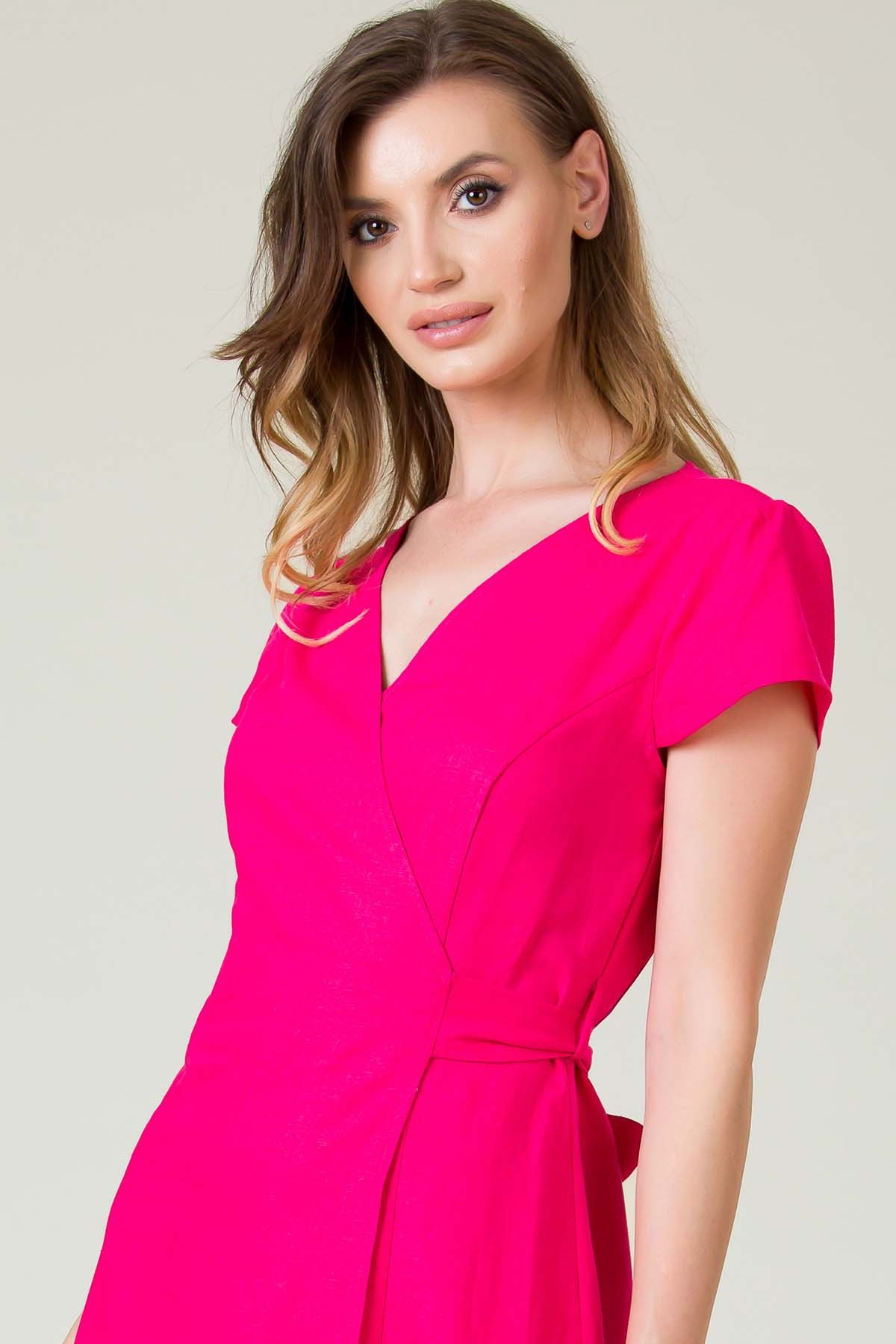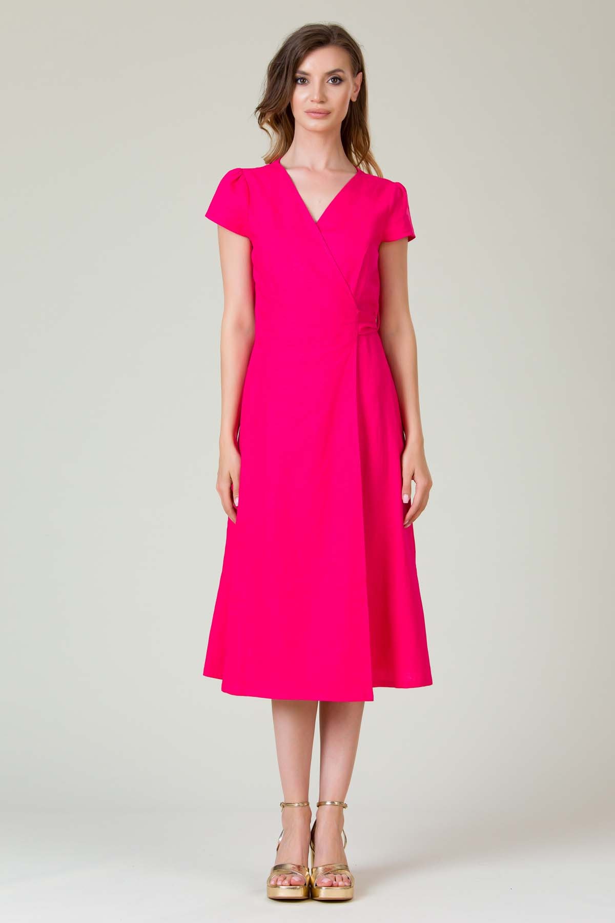 Rochie Darya din in, croi in clini de lungime midi, cu fetele suprapuse si cordon cu tighele ornamentale legat pe o parte, excelenta pentru zilele toride.
