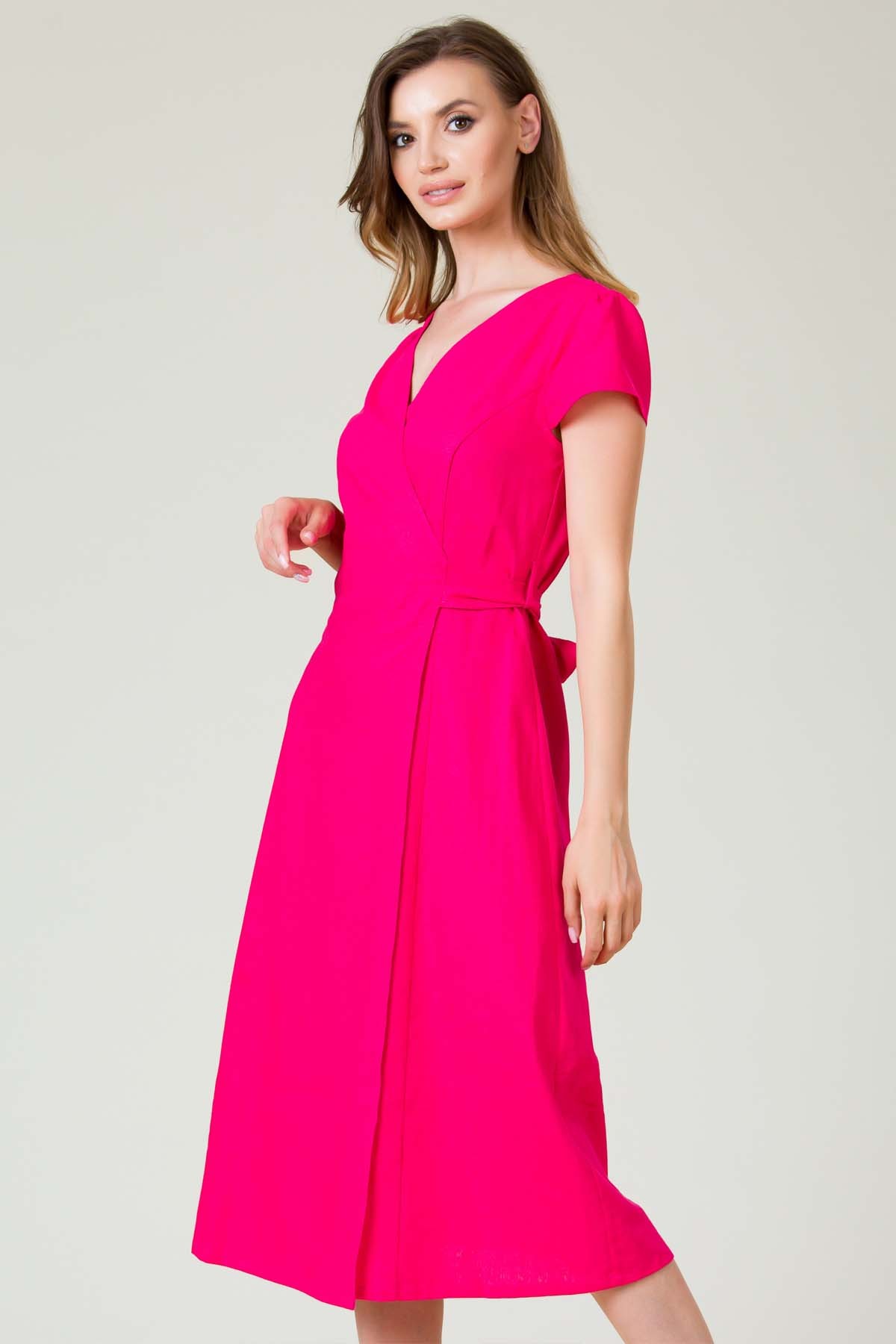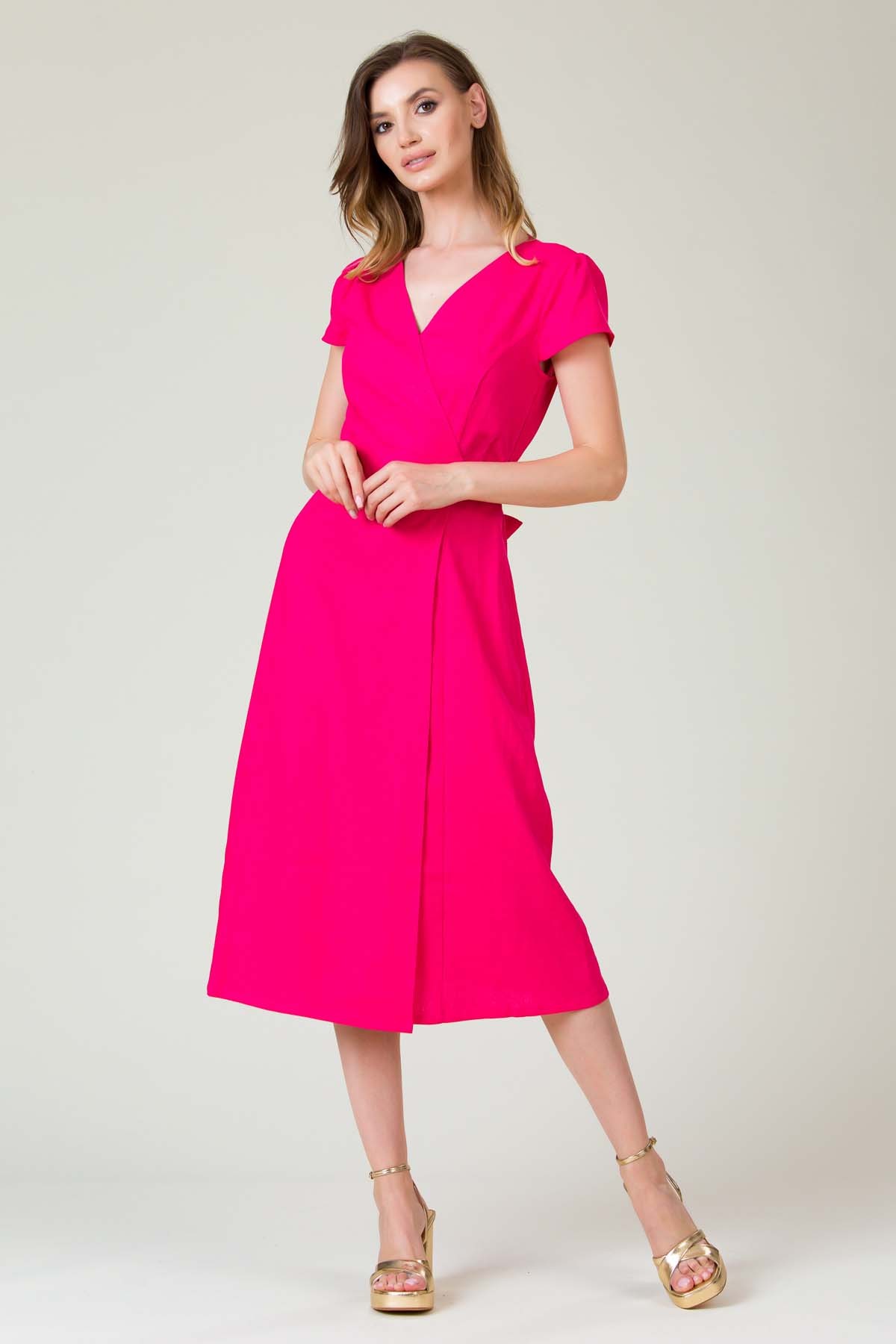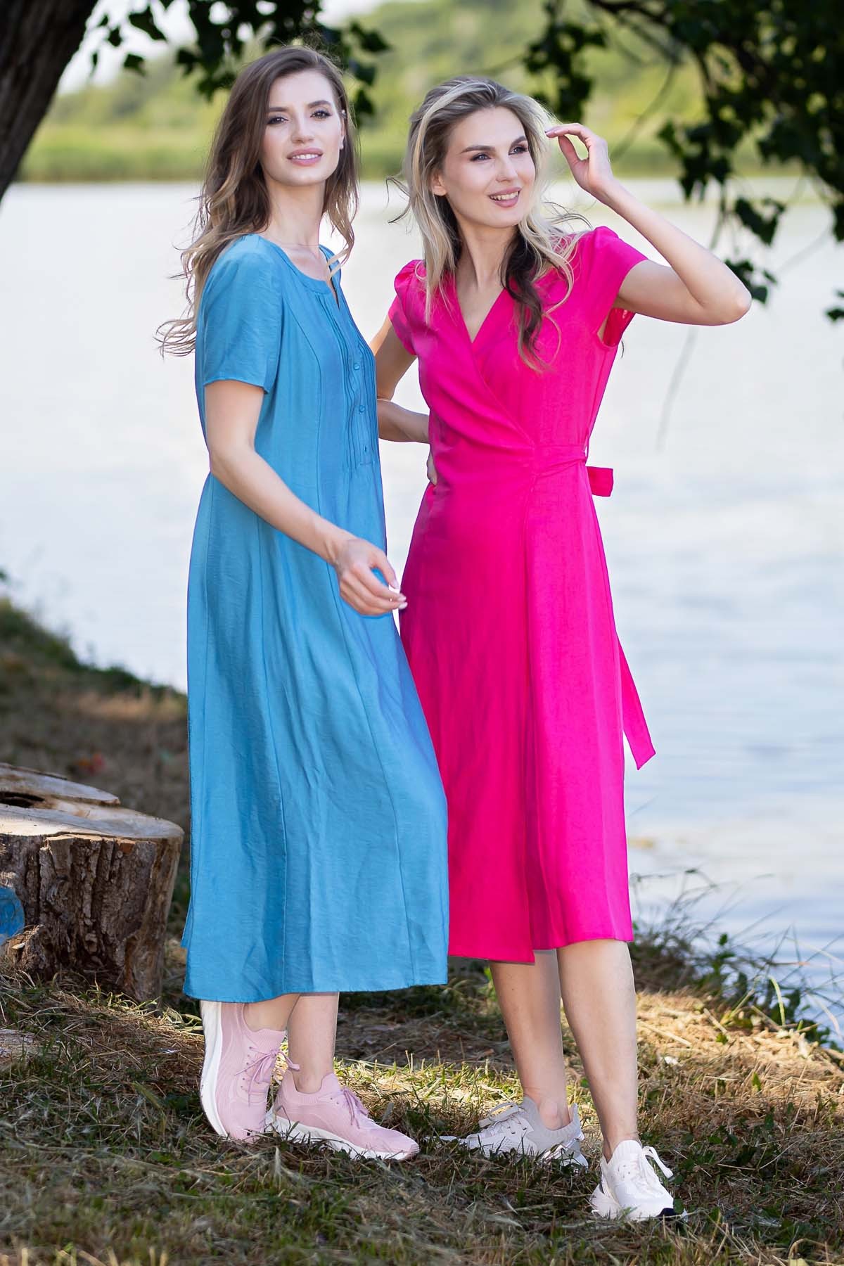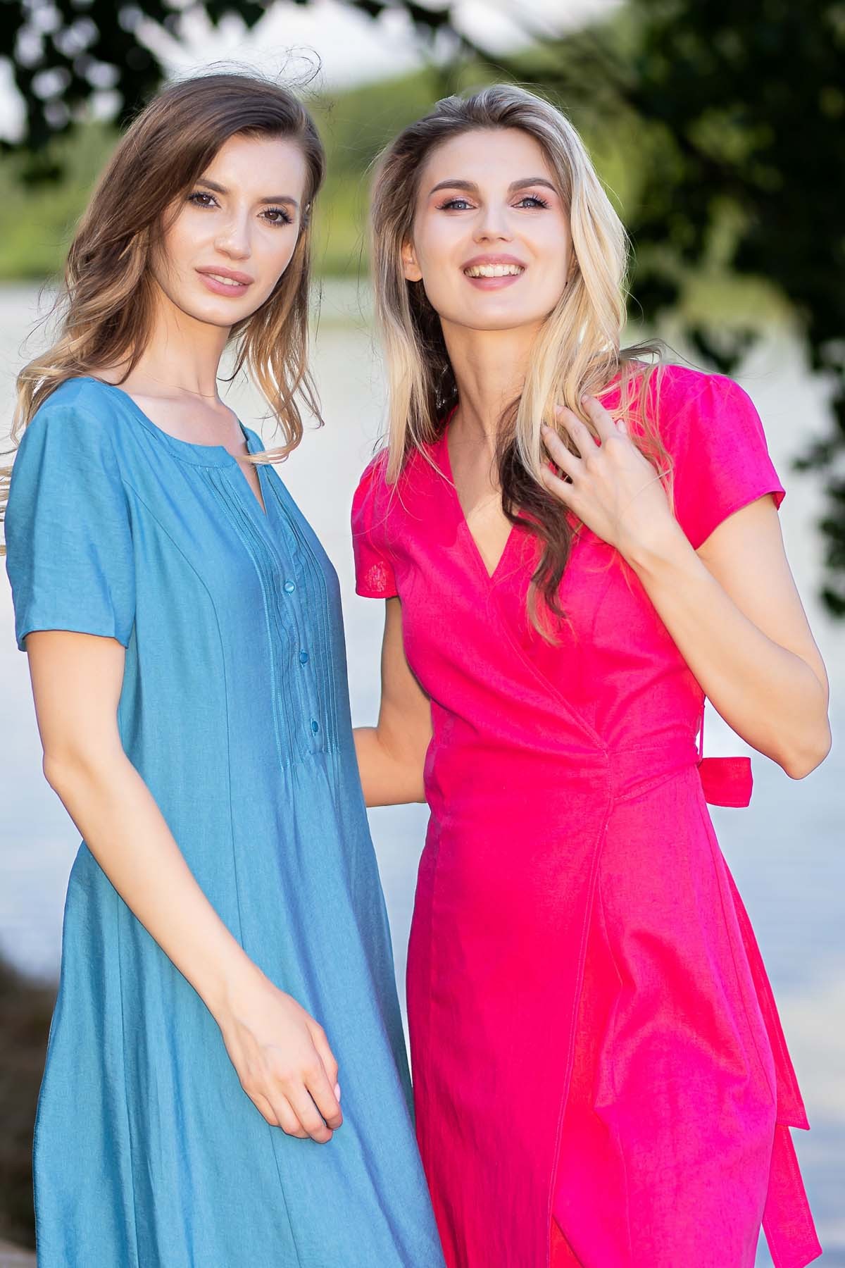 Rochie Darya din in, croi in clini de lungime midi, cu fetele suprapuse si cordon cu tighele ornamentale legat pe o parte, excelenta pentru zilele toride.