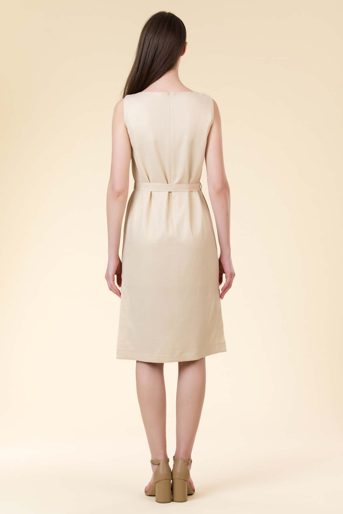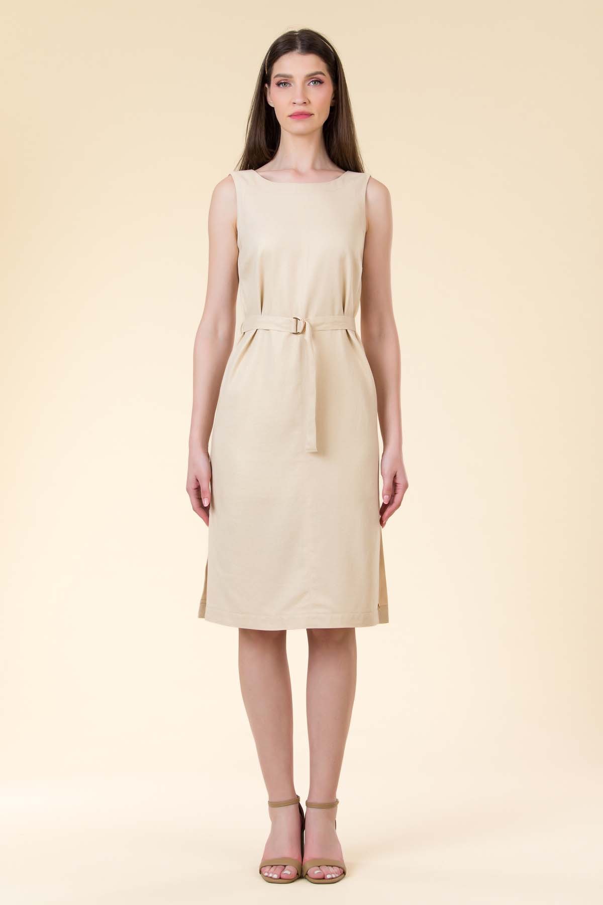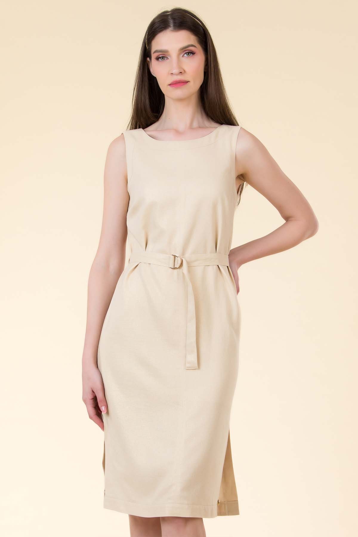 Rochie Diane din in peliculizat, croi chic cu slituri laterale, tighele decorative si cordon in talie cu inele metalice.