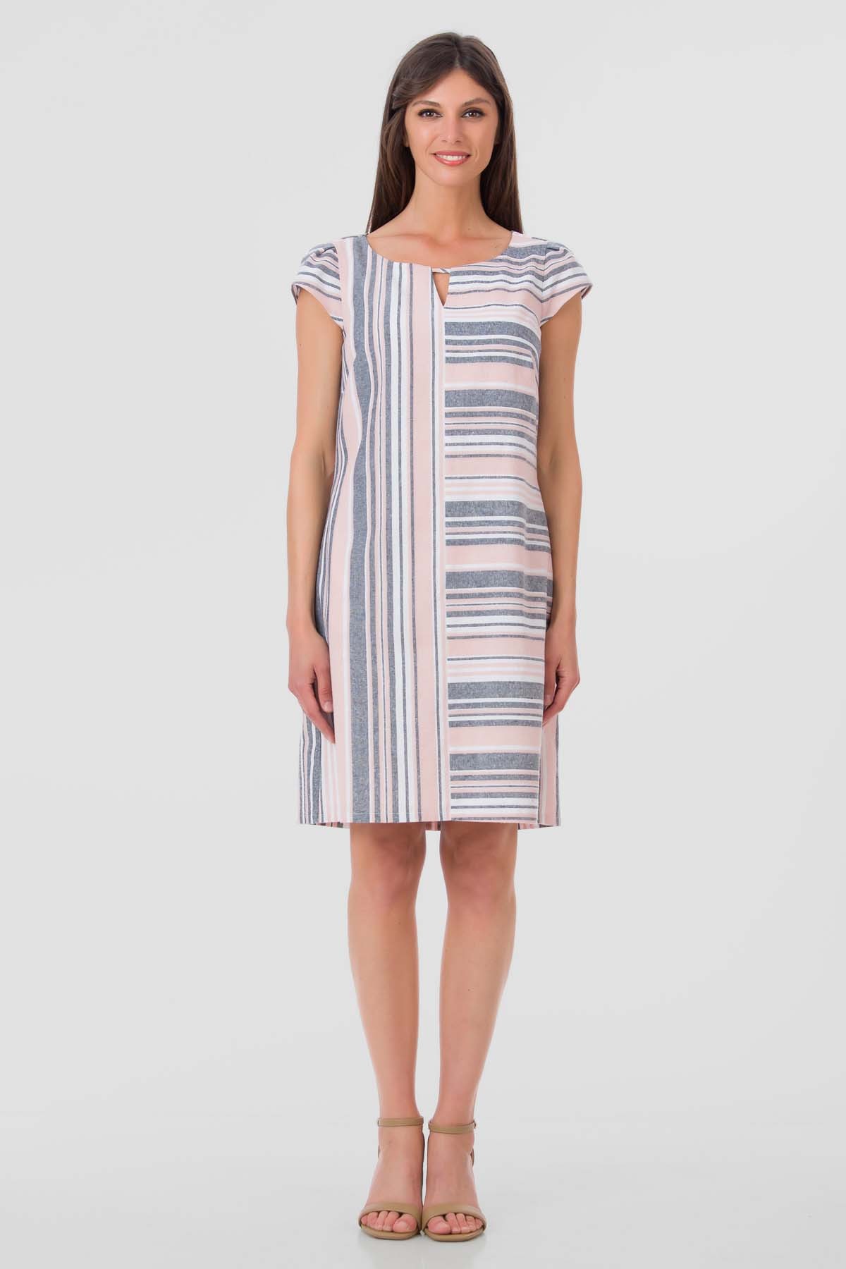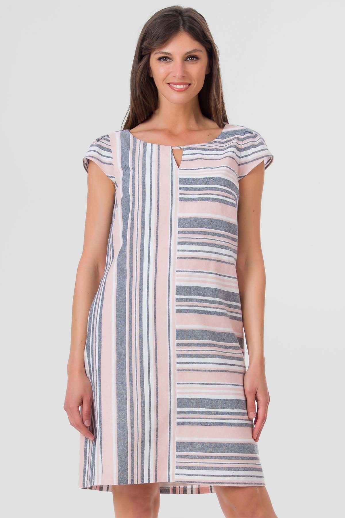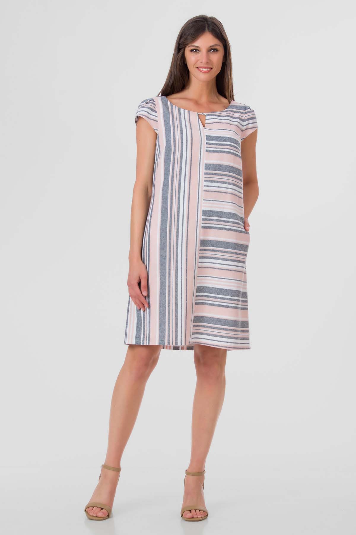 Rochie Vera din amestec de viscoza si in, design cu asimetrie de dungi, croiala in A cu buzunare laterale. Foarte confortabila in zilele de vara.
