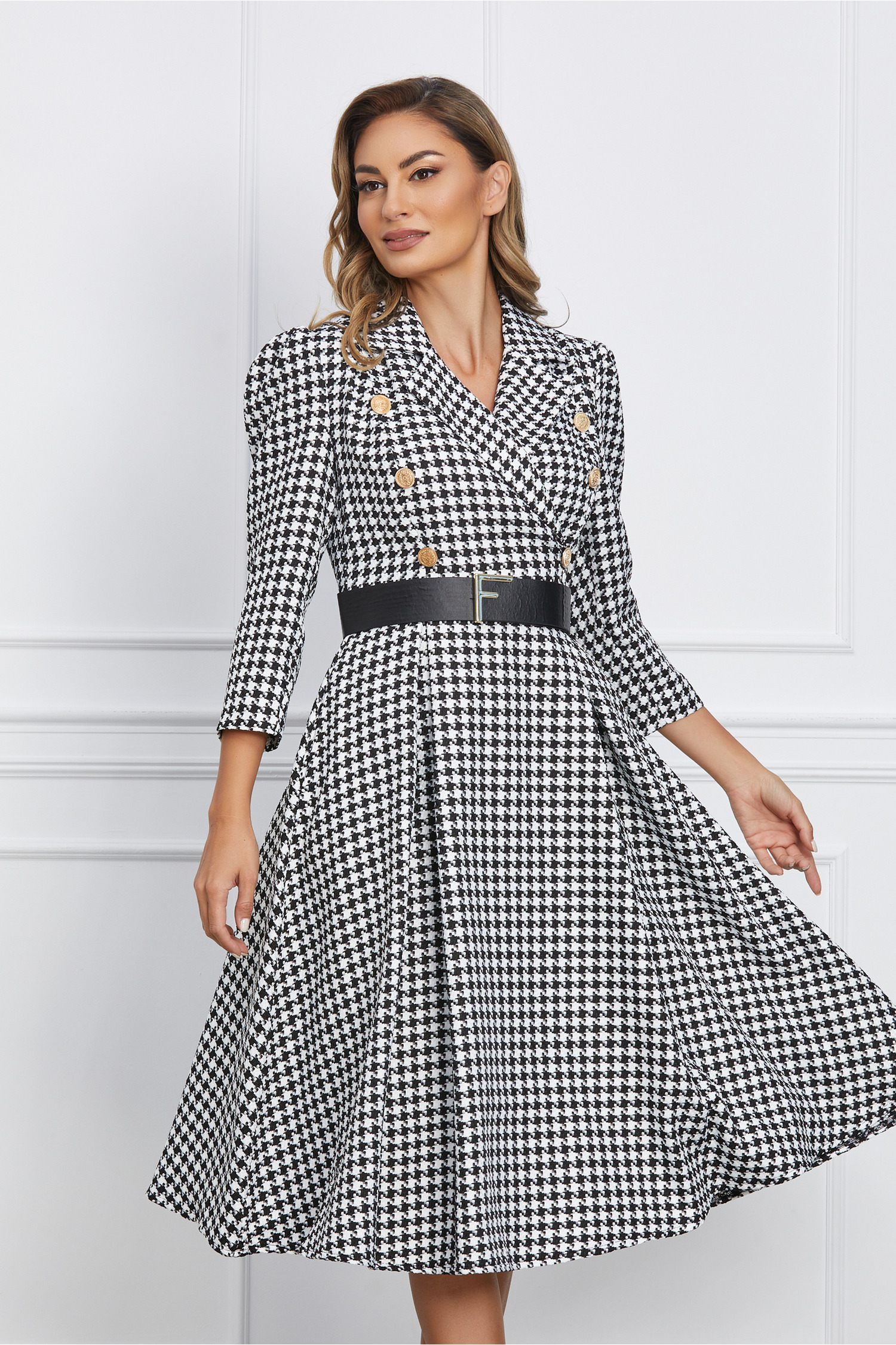 Rochie tip sacou cu nasturi decorativi la bust si curea detasabila in talie. Are decolteu in V petrecut, rever crestata, maneci trei sferturi, croi clos si buzunare functionale. Rochie tip sacou Decolteu in V Rever crestat Maneci trei sferturi Croi clos Curea in talie Buzunare functionale Captusita doar la bust Se inchide cu fermoar lateral Material: Tweed, viscoza Compozitie: 70% Viscoza, 25% Poliester, 5% Lycra Instructiuni de intretinere: *Va rugam verificati eticheta produsului inainte de curatare! *Pozitia tiparului imprimeului poate fi diferita datorita taierii. *Modelul are inaltimea de 174 cm. *Va rugam sa retineti ca o usoara discrepanta de culoare ar trebui sa fie acceptabila datorita luminii si luminozitatii ecranului. *Va rugam verificati ghidul de marimi, in cm, pentru a alege corect marimea.