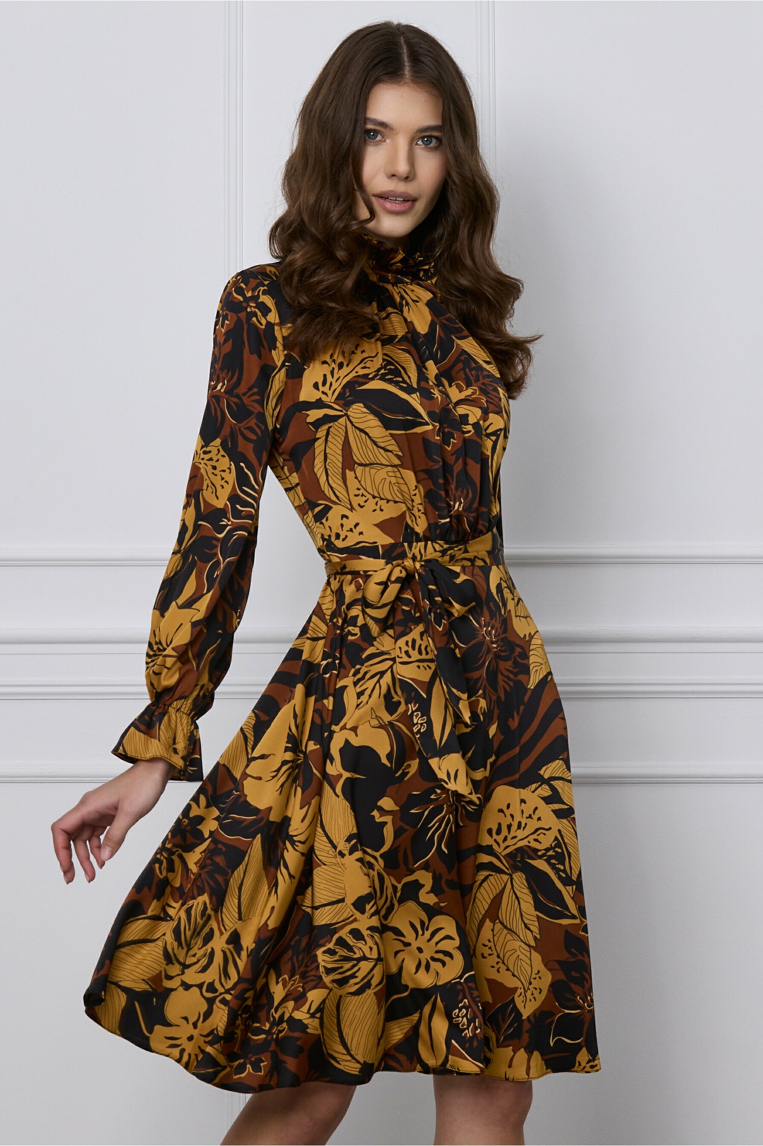 Comandă o Rochie Iris maro din satin cu imprimeu galben mustar cu LIVRARE și RETUR GRATUIT!