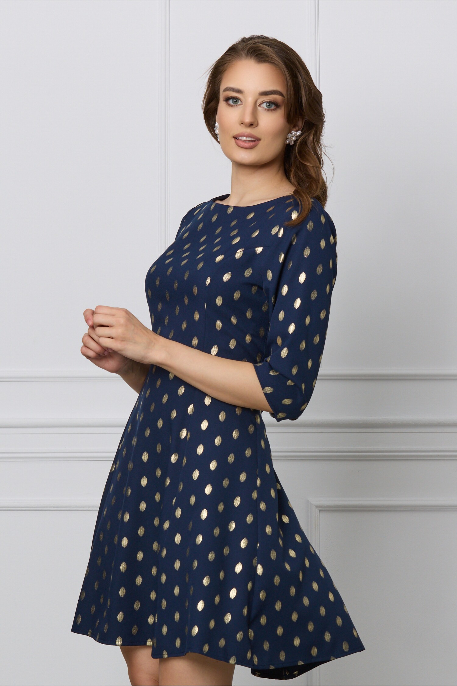 O rochie cu imprimeu, in croi clos, cu maneci trei sferturi si decolteu rotund, perfecta atat pentru o zi la birou, cat si pentru o plimbare cu prietenii. Rochie office Decolteu rotund Cu maneci trei sferturi Croiul clos Nu are captuseala Se inchide cu fermoar la spate Material: Crep Compozitie: 95% poliester, 5% elastan *Va rugam verificati eticheta produsului inainte de curatare! *Pozitia tiparului imprimeului poate fi diferita datorita taierii. *Va rugam sa retineti ca o usoara discrepanta de culoare ar trebui sa fie acceptabila datorita luminii si luminozitatii ecranului. *Va rugam verificati ghidul de marimi, in cm, pentru a alege corect marimea.