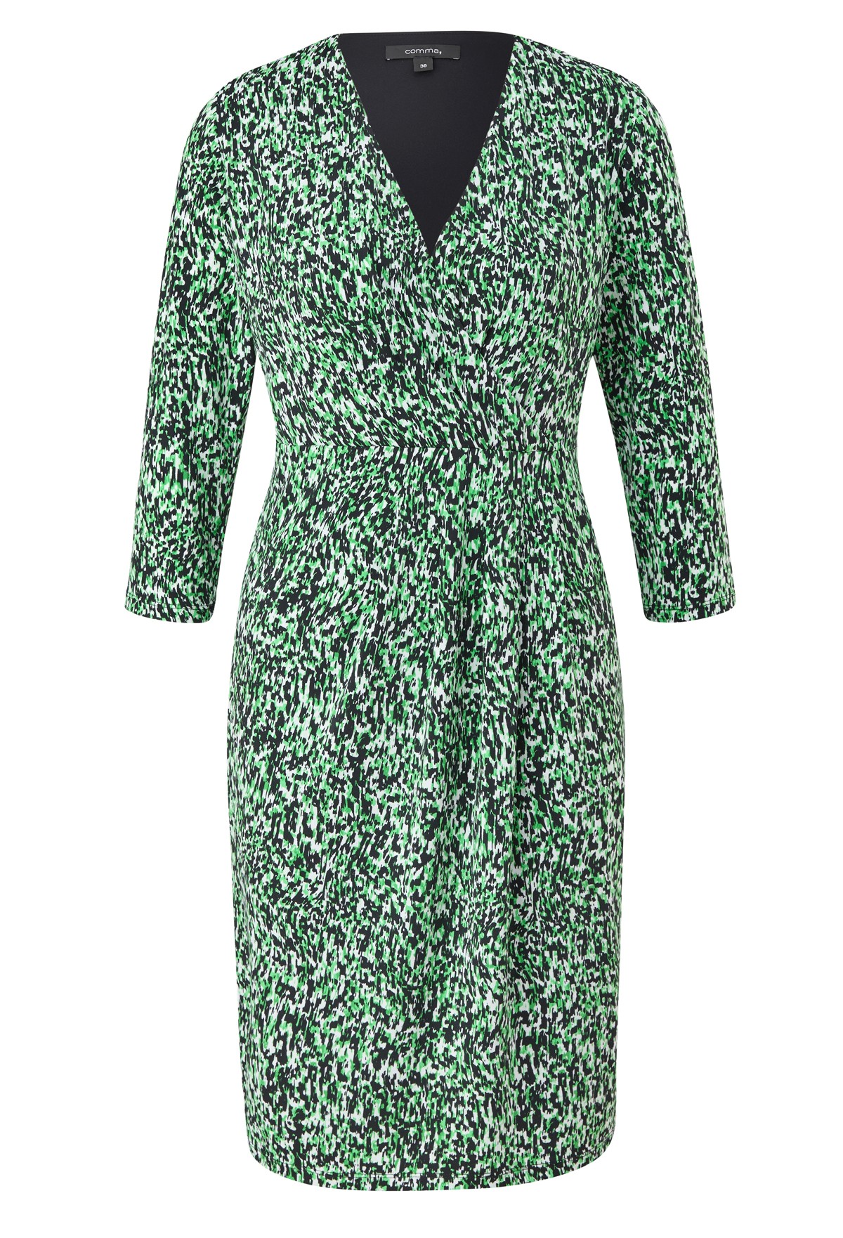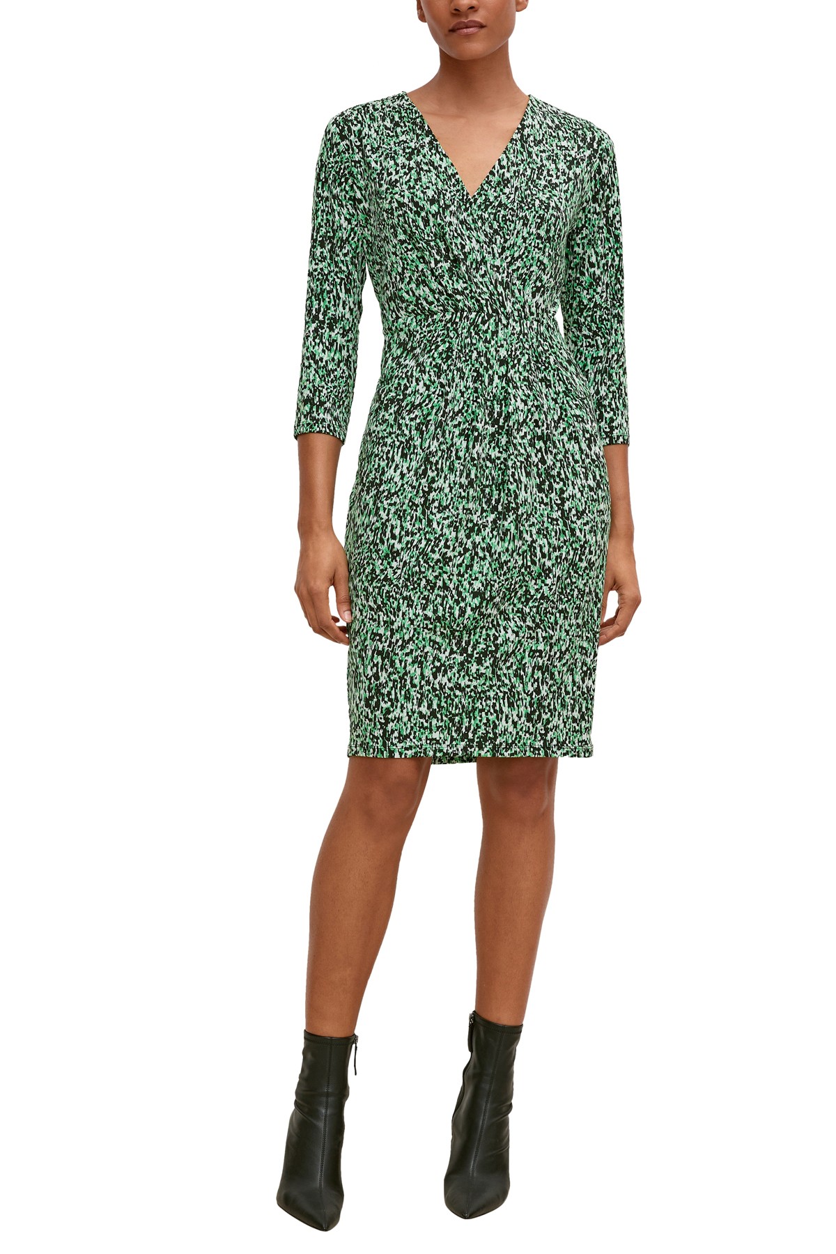 Rochie jersey imprimat, croi feminin cu repere fata suprapuse, decolteu in V si maneca 3/4.