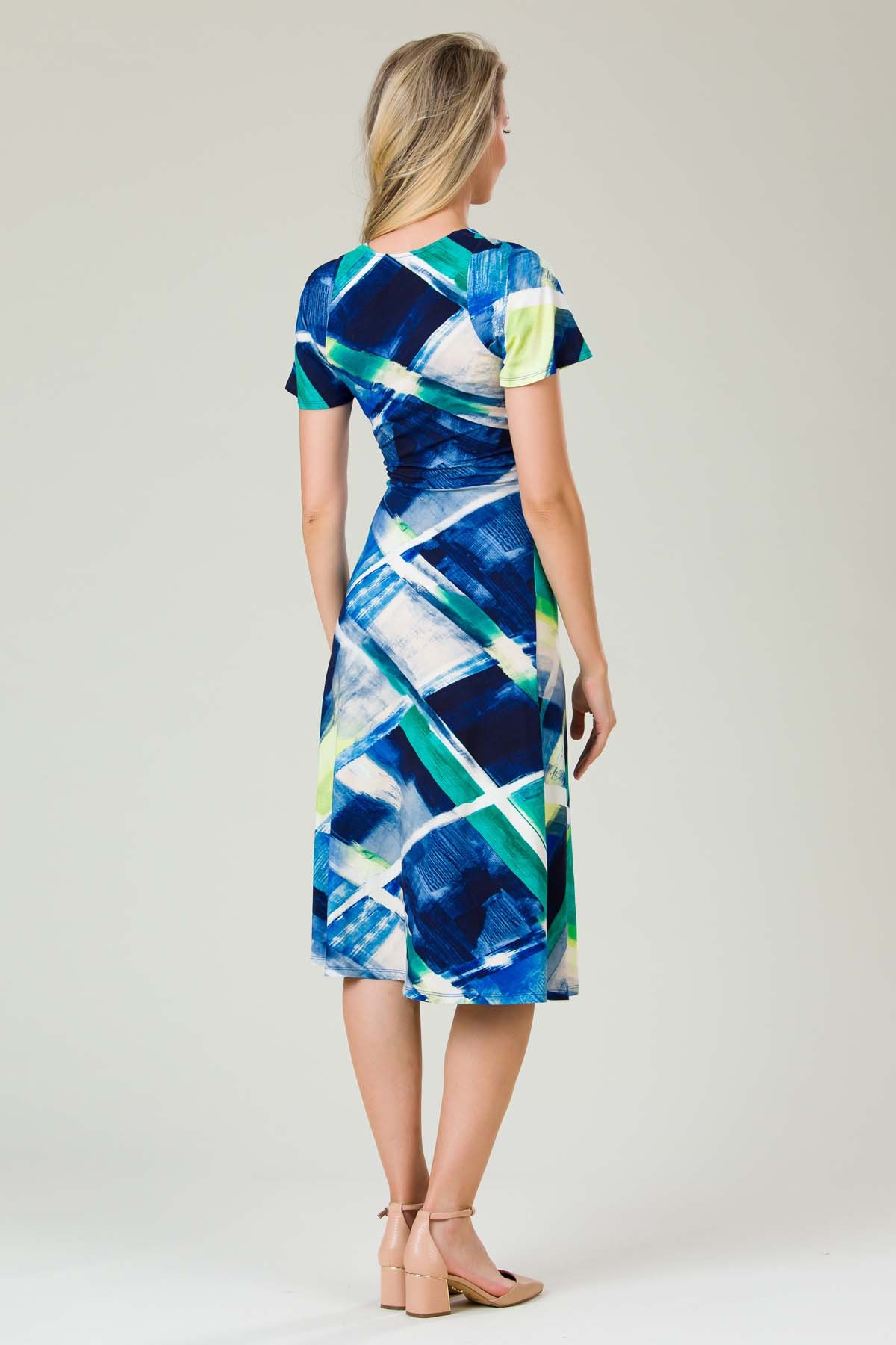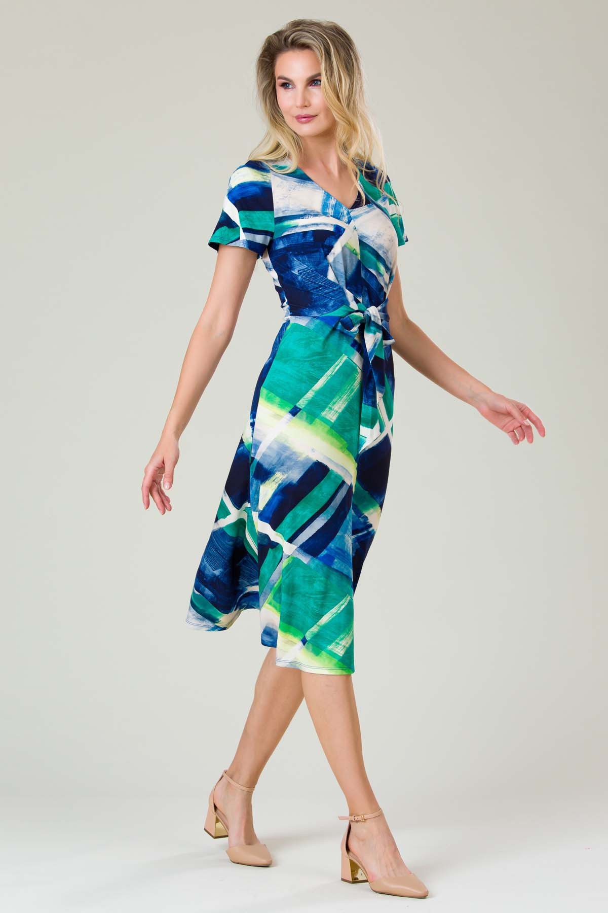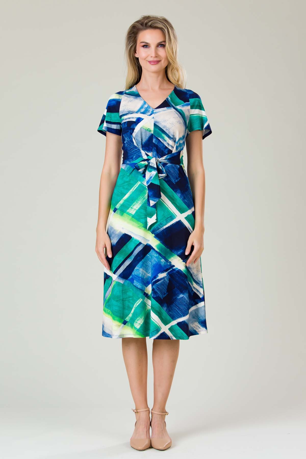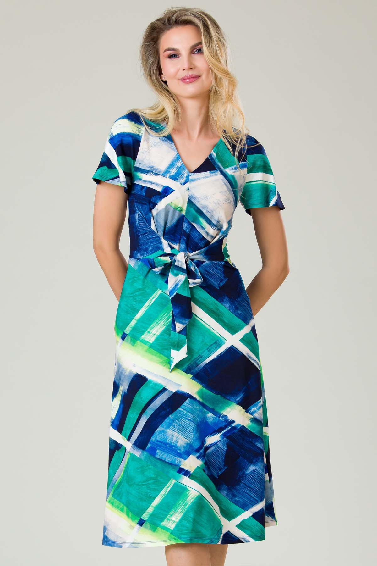 Rochie Serenna din jersey imprimat, croiala lejera cu cordon legat in fata, decolteu anchior si maneca raglan.