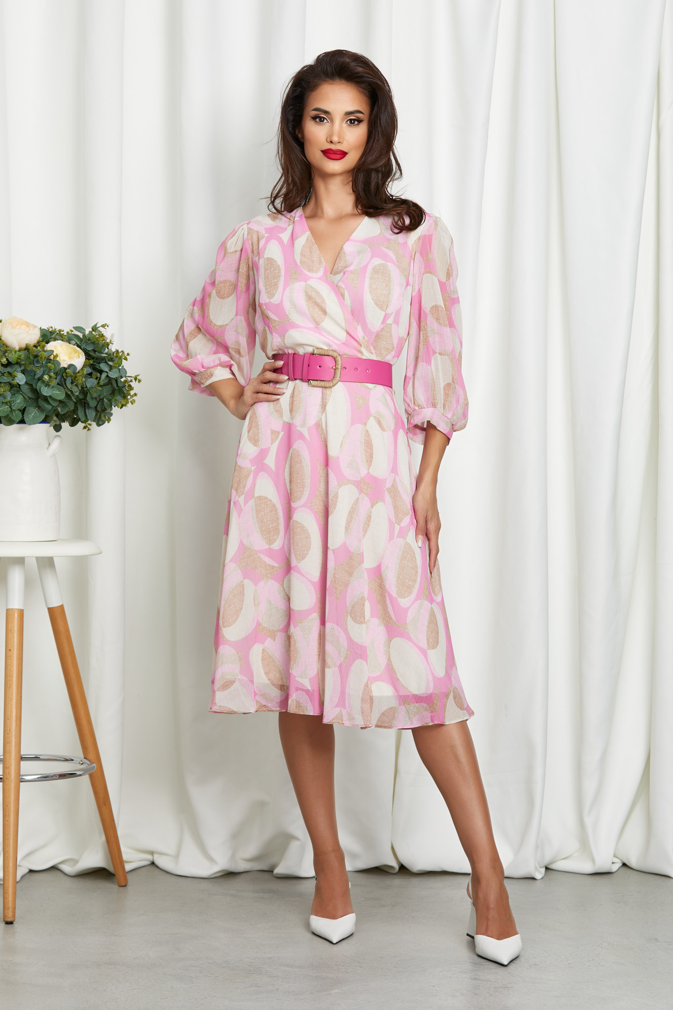 Rochie eleganta, midi, din voal cu imprimeu roz, perfecta atat pentru un eveniment de zi cat si pentru un eveniment de seara. Este o combinatie de clasic si modern perfecta atat pentru tinute office, tinute formale dar si elegante. material neelastic fermoar lateral decolteu in V petrecut maneci trei sferturi dublata de jupon curea in talie Dimensiuni disponibile: XL, XXL, 3XL, 4XL