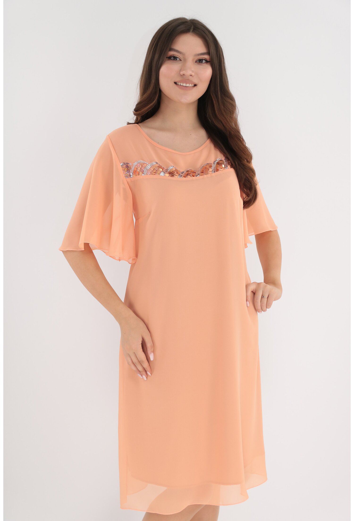 -Rochie din voal roz-piersica accesorizata cu paiete -Captusita -Croiala lejera -Decolteu rotund -Maneci scurte evazate -Inchidere discreta la spate cu nasture -Fabricat in Romania MATERIAL:  40% Vascoza, 60% Poliester Captuseala:  40% Vascoza, 60% Poliester LUNGIME:  107 cm la marimea 42, lungimea creste cu 1 cm la fiecare marime