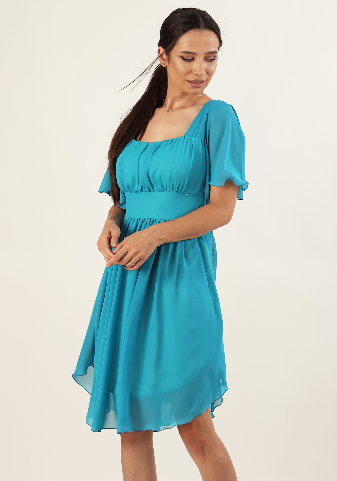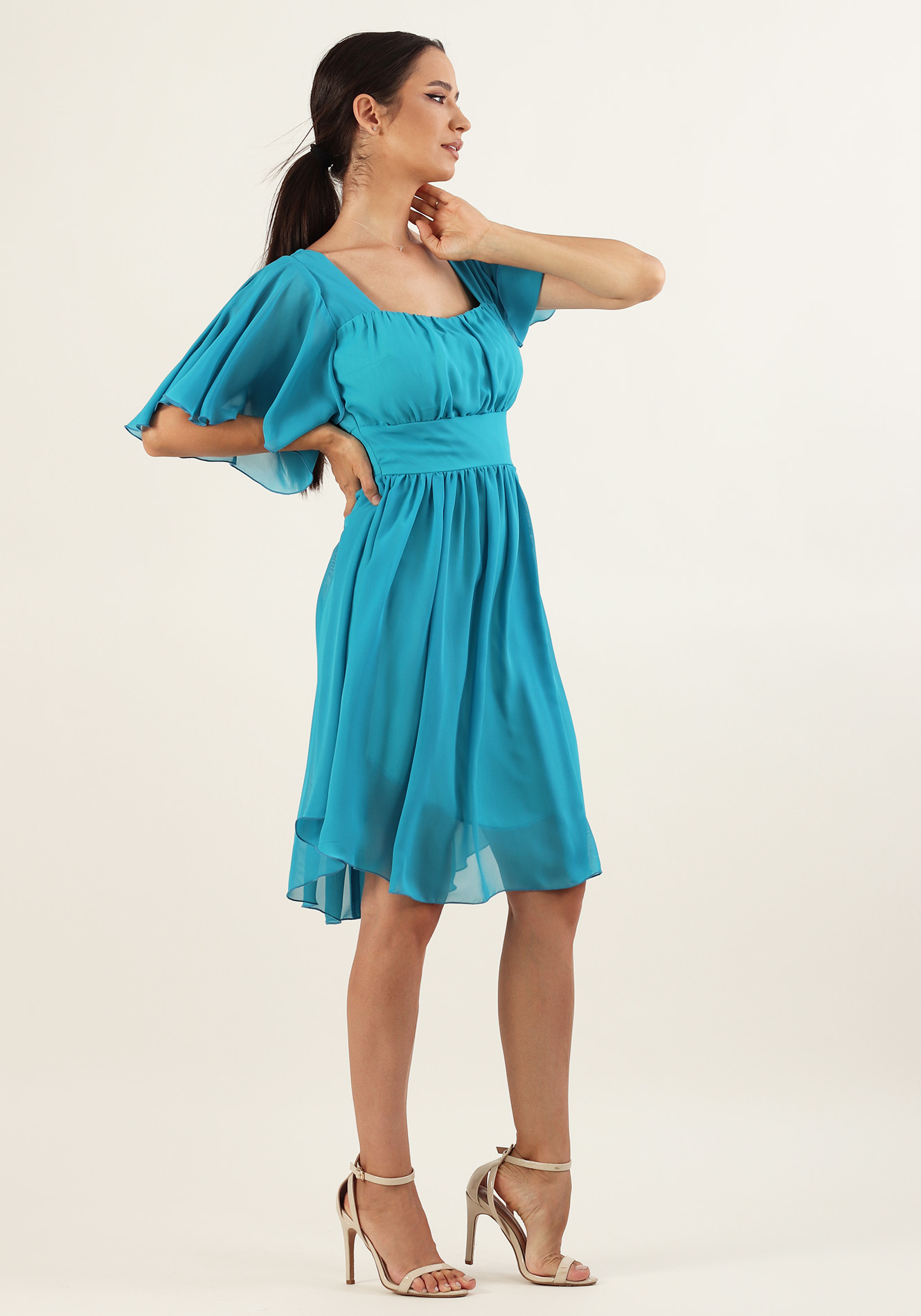 Rochie lejera cu decolteu adanc in fata si rotund in spate,maneca scurta tip volan,bustul cu cret fata spate,taiata in talie cu banta,fusta lejera cu cret in talie,captusita,inchidere la spate cu fermoar ascuns.Material voal