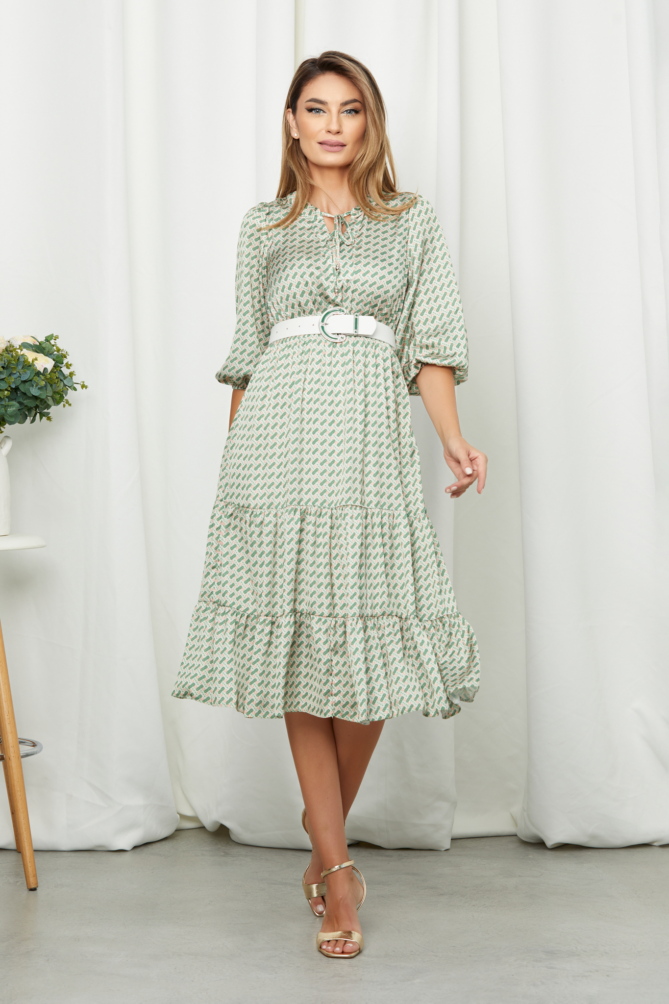 Rochie midi eleganta cu imprimeu vernil, croi lejer si maneci lungi perfecta pentru foarte multe ocazii. Este o combinatie de clasic si modern perfecta atat pentru tinute office, tinute formale dar si elegante. material usor elastic decolteu rotund prevazut cu snur fara fermoar maneci lungi cu elastic la baza volan in partea inferioara dublata de jupon curea in talie Dimensiuni disponibile: S, M, L, XL