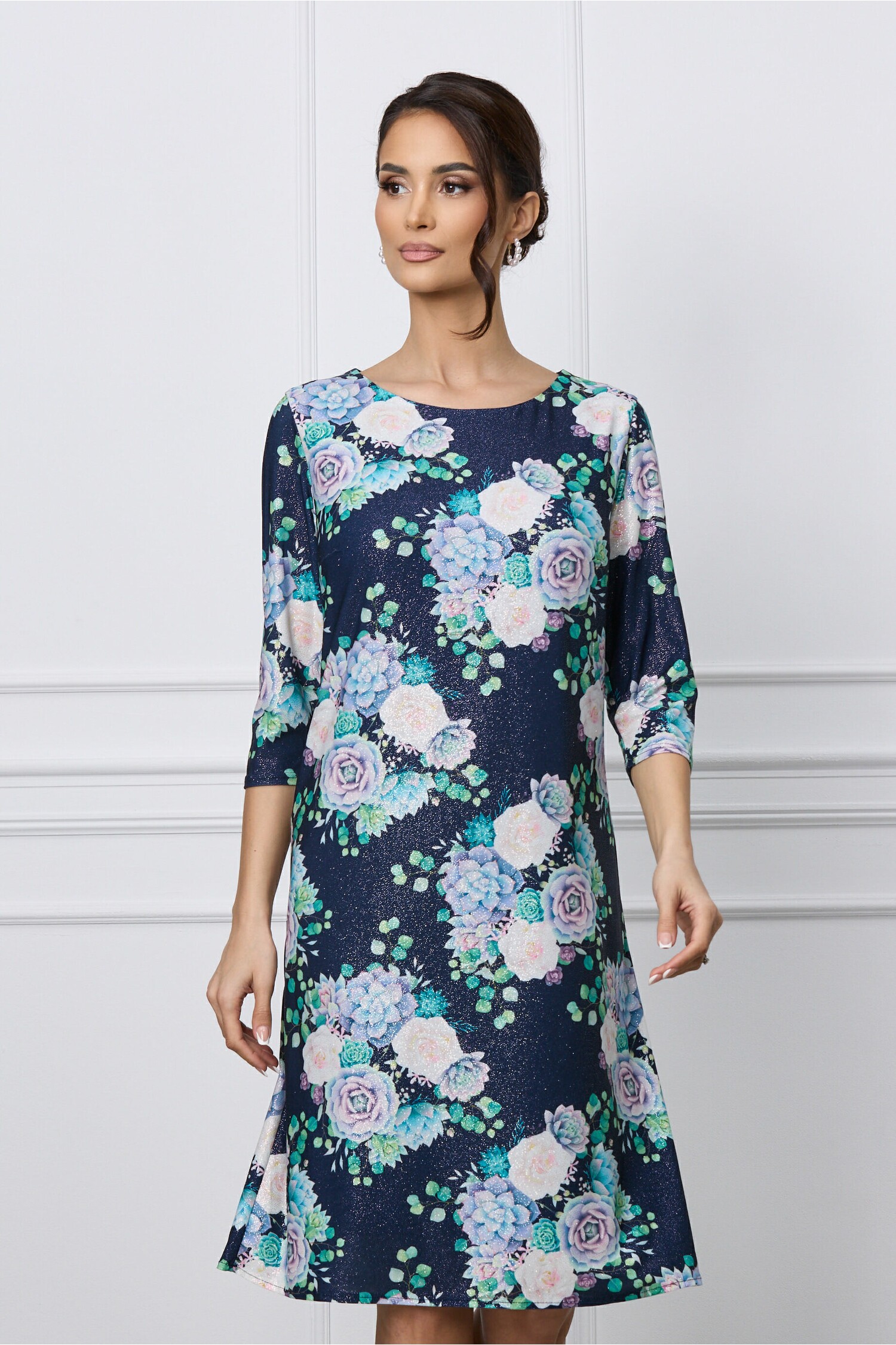 Rochie vaporoasa cu glitter. Are decolteu rotund, maneci trei sferturi si croi drept. Rochie vaporoasa Decolteu rotund Maneci trei sferturi Croi drept Captusita pe interior Material: Lycra Compozitie: 100% Poliester *Va rugam verificati eticheta produsului inainte de curatare! *Pozitia tiparului imprimeului poate fi diferita datorita taierii. *Modelul are inaltimea de 174 cm. *Va rugam sa retineti ca o usoara discrepanta de culoare ar trebui sa fie acceptabila datorita luminii si luminozitatii ecranului. *Va rugam verificati ghidul de marimi, in cm, pentru a alege corect marimea.