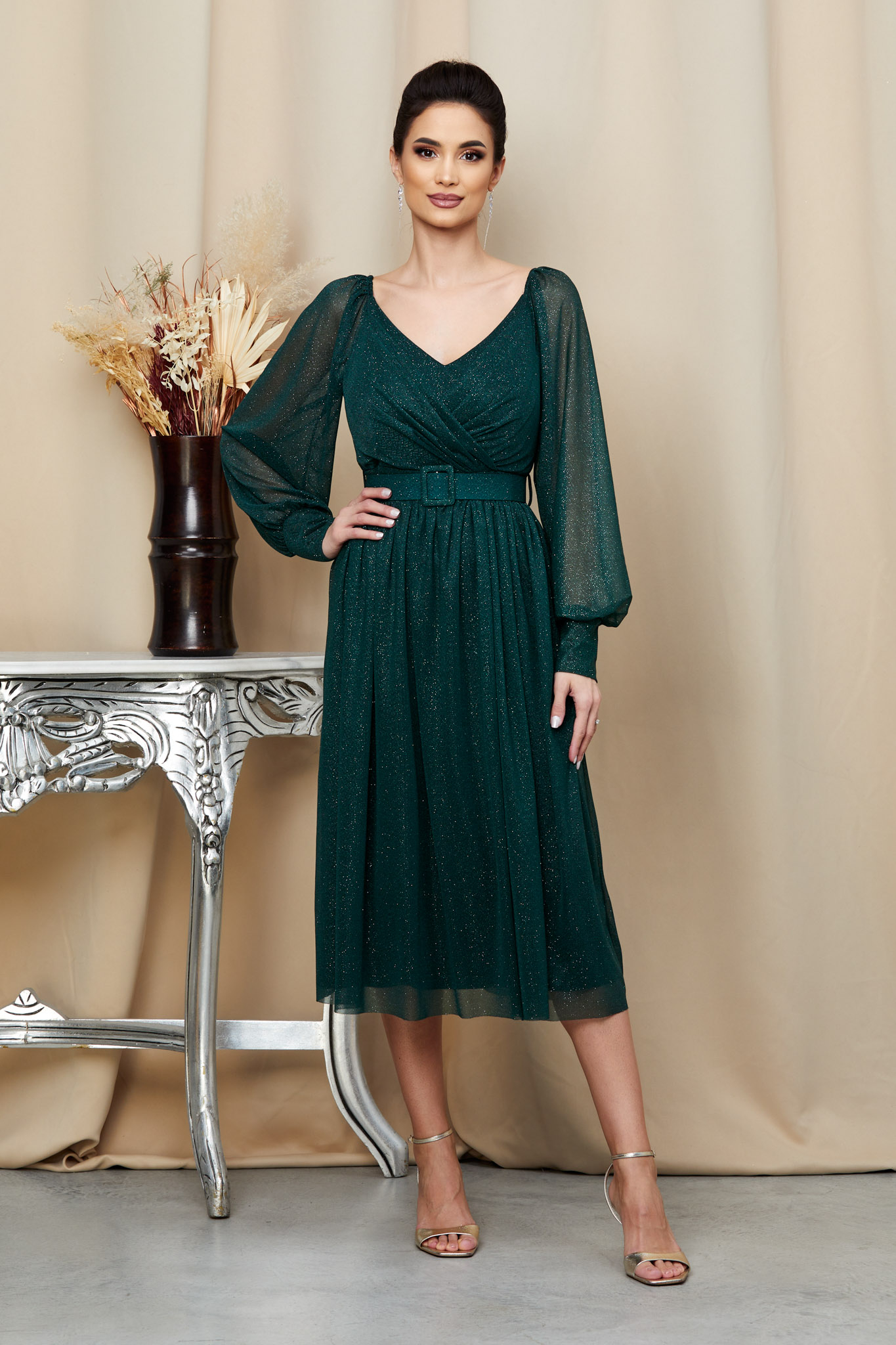 Rochie de ocazie verde midi din voal cu sclipici, cu maneci lungi, forma baby doll, precum si design-ul special o fac ideala pentru seri deosebite unde sigur vei iesi in evidenta. Trebuie sa ai aceasta rochie delicata in dressingul tau. material usor elastic fermoar ascuns la spate decolteu in V fata/spate bust buretat maneci lungi voal cu sclipici jupon din licra talie marcata Dimensiuni disponibile: XXL, 3XL, 4XL, 5XL