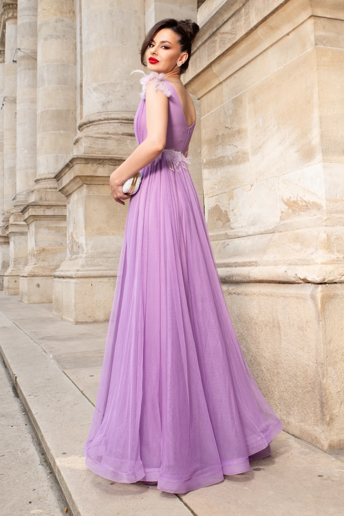 Rochie lunga de seara lila Petronela decorata cu banda din fulgi ; Culoare: lila ; Croi: tip printesa ; Textura: tulle fin vaporos ; Fara maneci ; Prezinta dublura ; Decolteu in V ; Bust buretat ; Banda din strassuri si fulgi decorativi in talie si pe umeri ; Inchidere cu fermoar la spate ; Rejansa pentru volum in partea de jos ; Compozitie: 100% poliester ; * Echipa noastra face toate eforturile in a prezenta cat mai bine culorile produselor prezentate pe site insa culorile pot diferi de situatia reala si pot varia în functie de setarile monitorului/dispozitivului dvs!