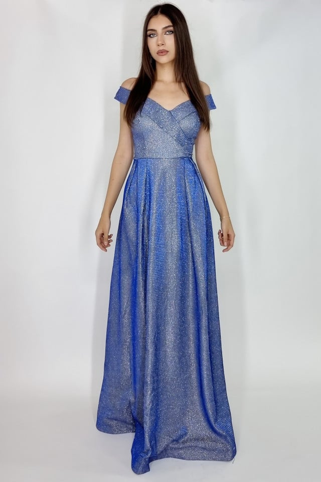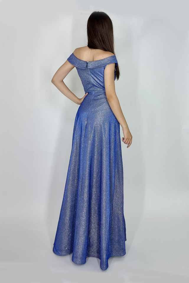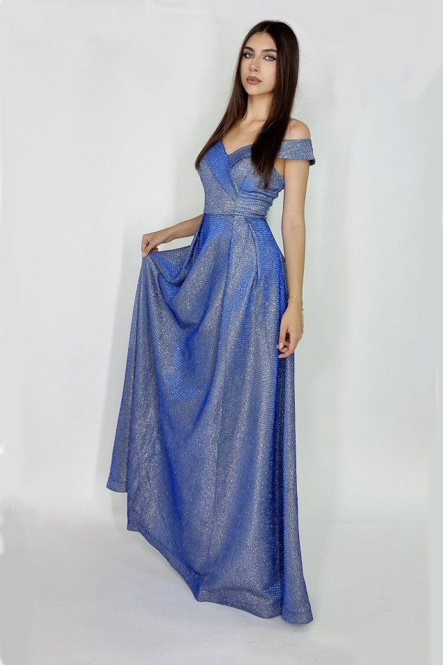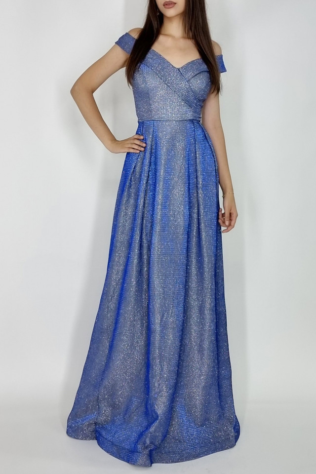 Rochie lunga Elize, cu pliuri definite si decolteu cu mansete pe umeri, Albastru, Marime: OneSize S/M