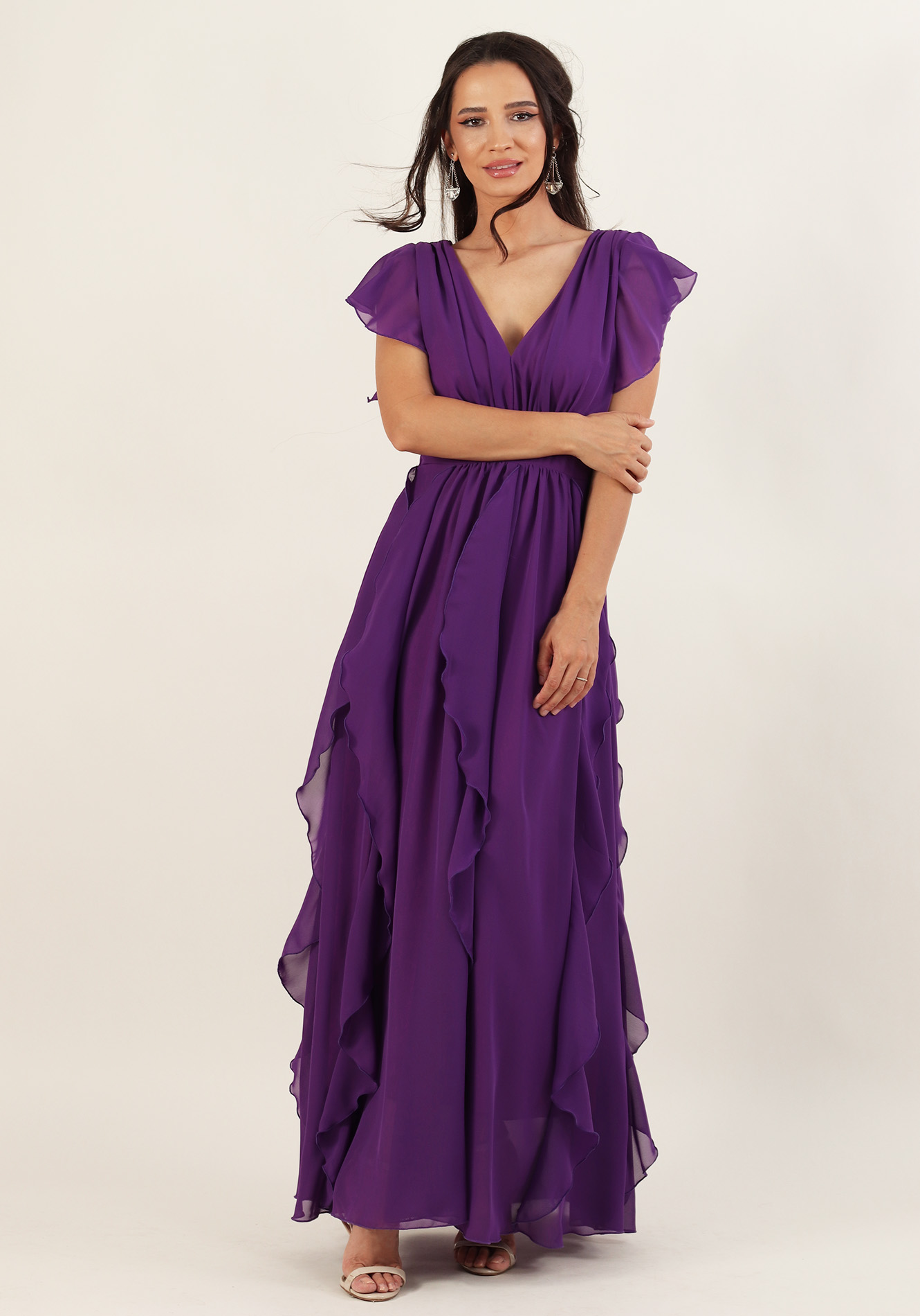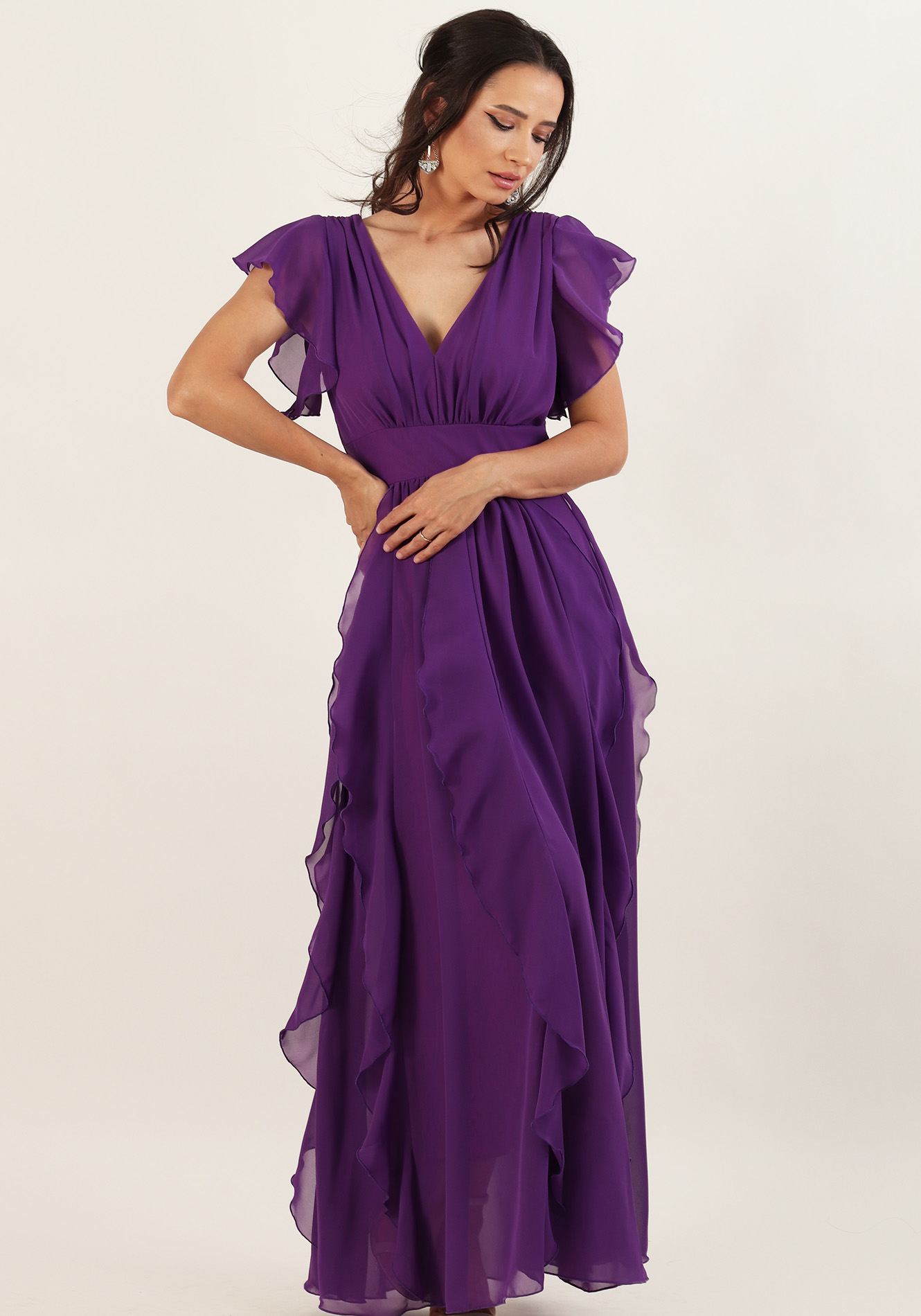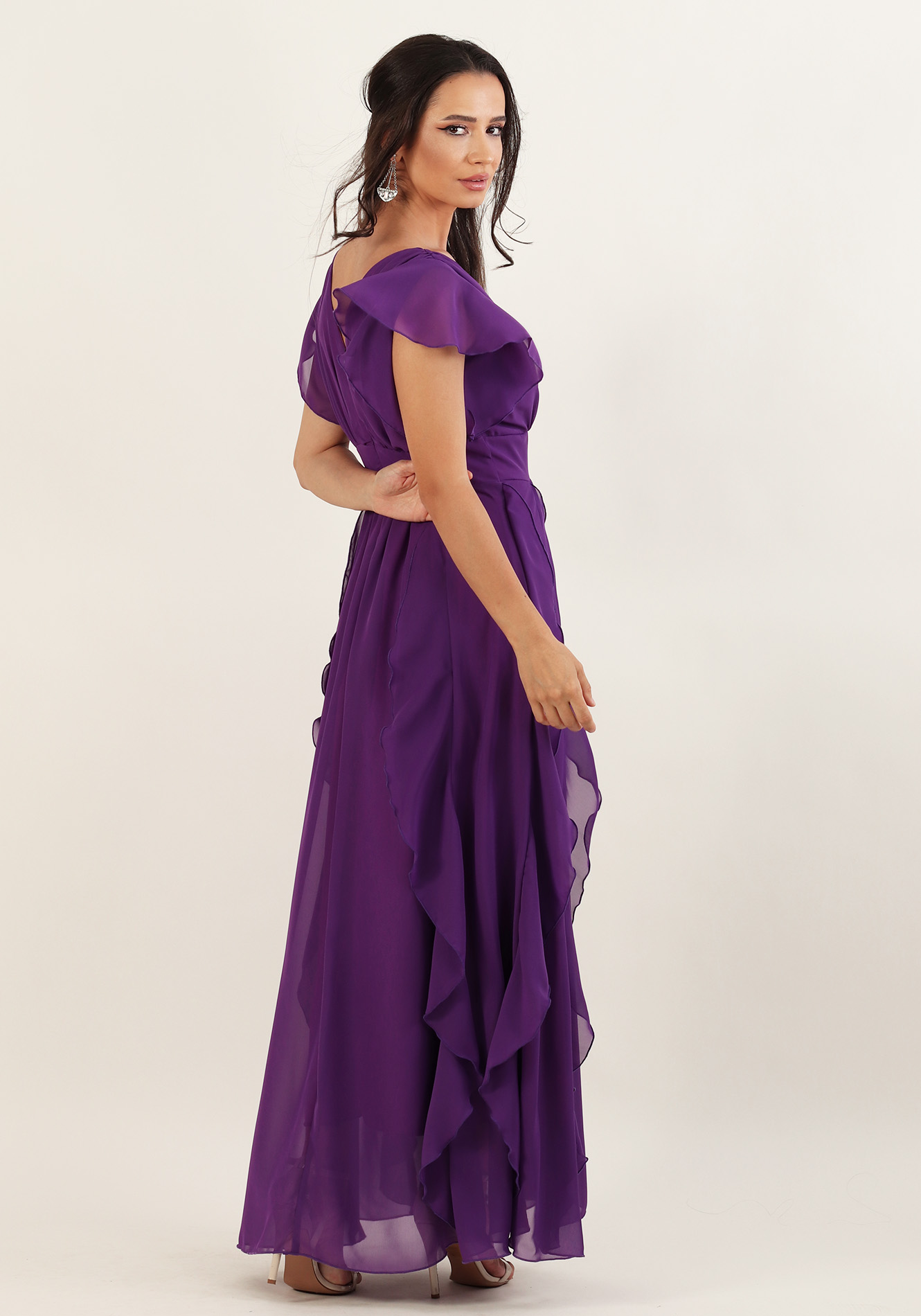 Rochie lunga in clini cu decolteu V in fata si in spate,maneca scurta tip volan,bustul cu cret la umar si in talie,taiata in talie cu banta,fusta lunga in clini cu volan integrat in cusatura,captusita,inchidere la spate cu fermoar ascuns.Material voal