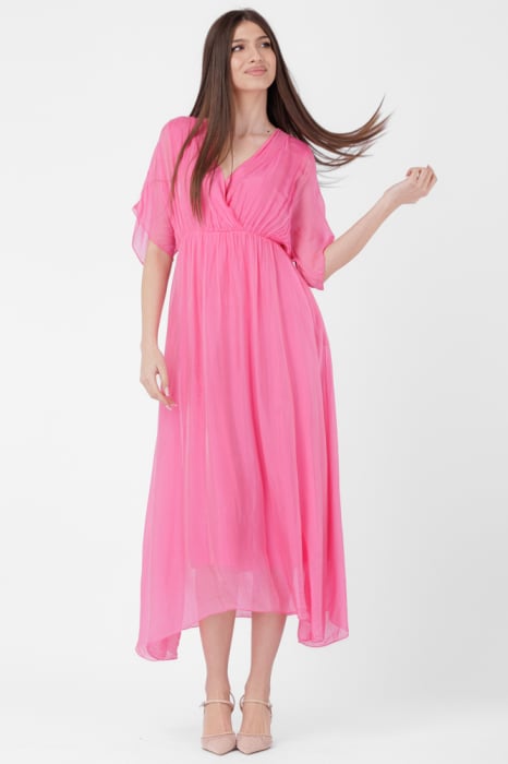 Decolteu petrecut, in V Are dublura extensibila, tip maieu, de aceeasi culoare Are maneci cazute scurte, fluture Are elastic in talie Are buzunare ascunse Are talie unica si se potriveste pentru marimile: S, M si L Material: 50% matase, 50% vascoza…