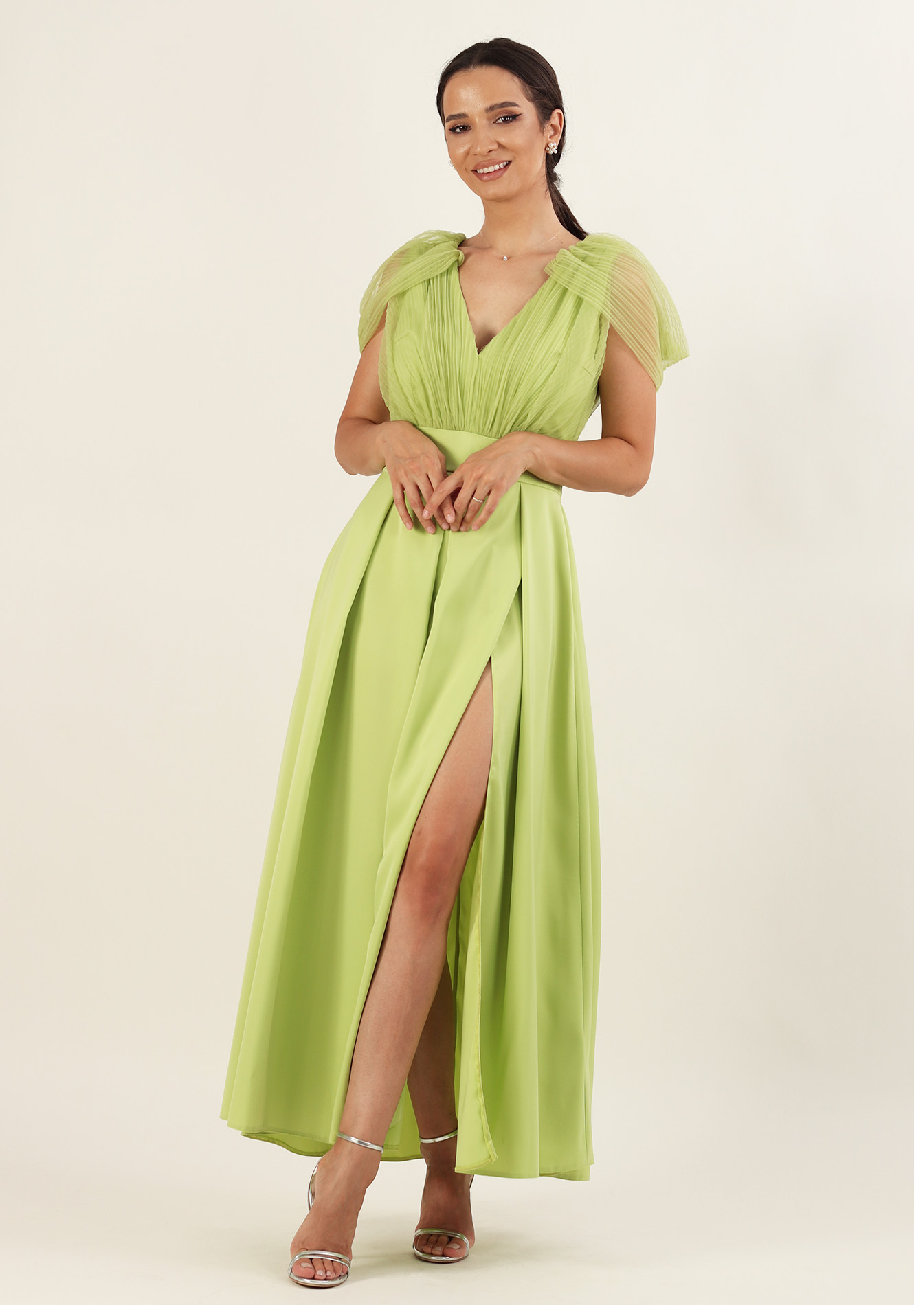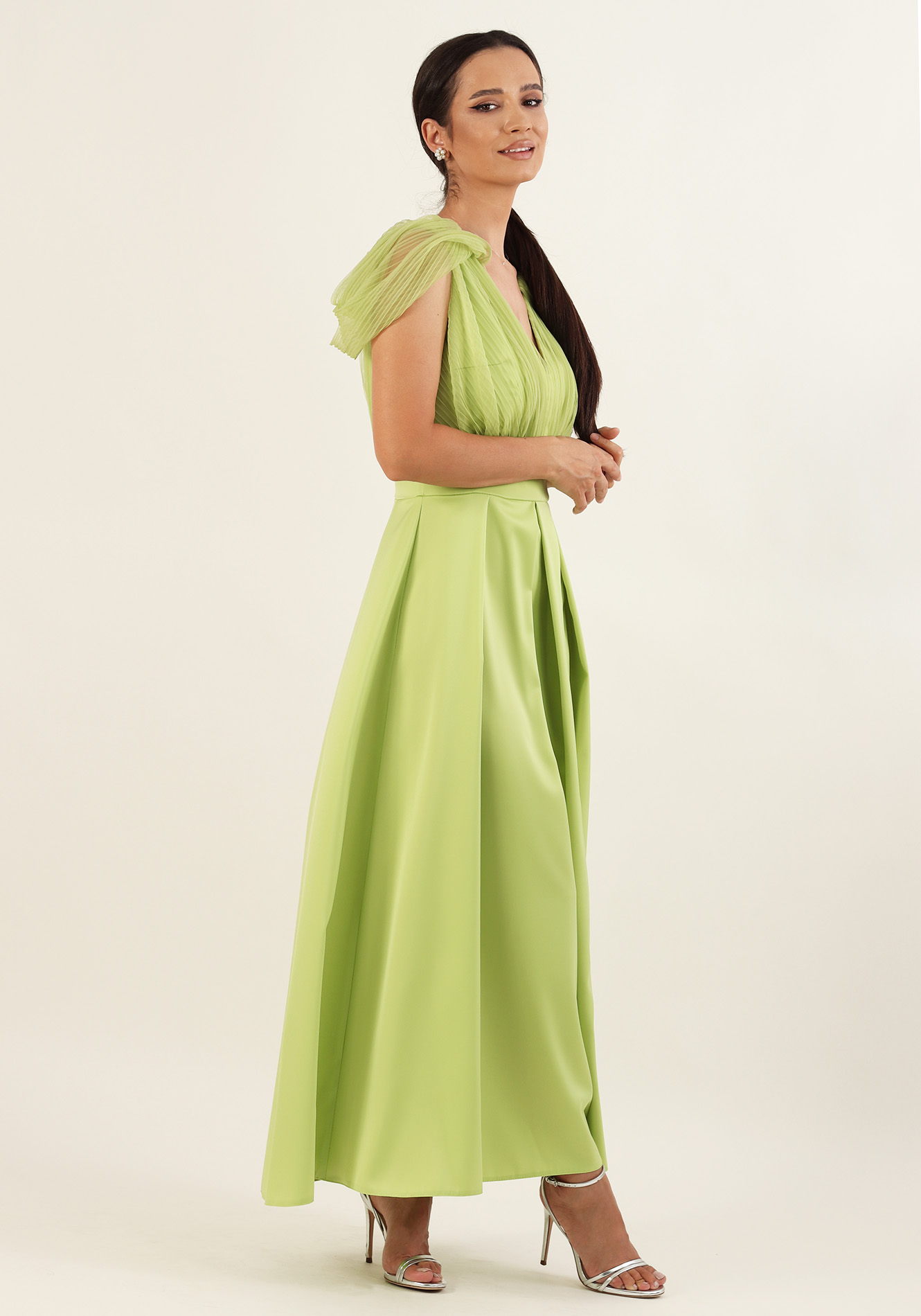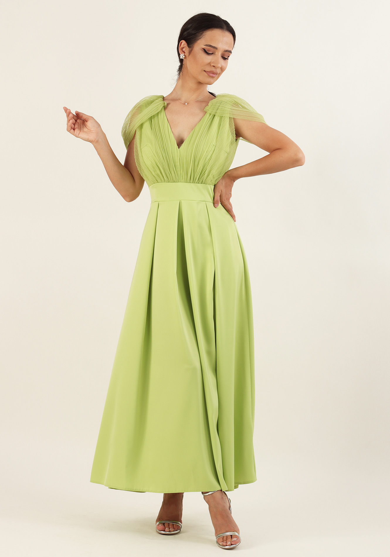 Rochie lunga cu decolteu V in fata si in spate,maneca cu cret decupata in zona umerilor,bustul cu cret,taiata in talie cu banta,fusta cu pliuri in talie si crepeu pe picior,captusita la bust,inchidere la spate cu fermoar ascuns.Material saten