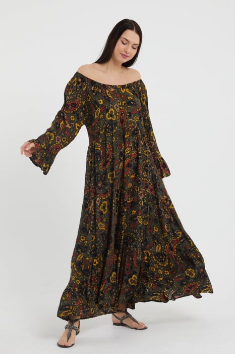 Are maneci lungi, evazate cu volane Decolteu barcuta cu elastic Rochia are patru volane care-i dau la baza o mare amploare Rochiile sunt talie unica si se potrivesc pentru masurile M si L Material: vascoza Descriere dimensiuni: umeri cazuti,…