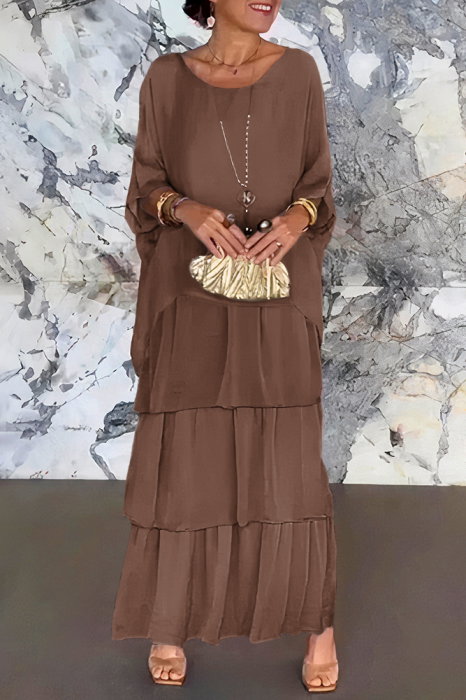 Comandă online o Rochie lunga suprapusa din matase si vascoza, cu trei volane mari si maneca cazuta, maro ciocolata cu livrare rapidă prin curier sau la easybox!