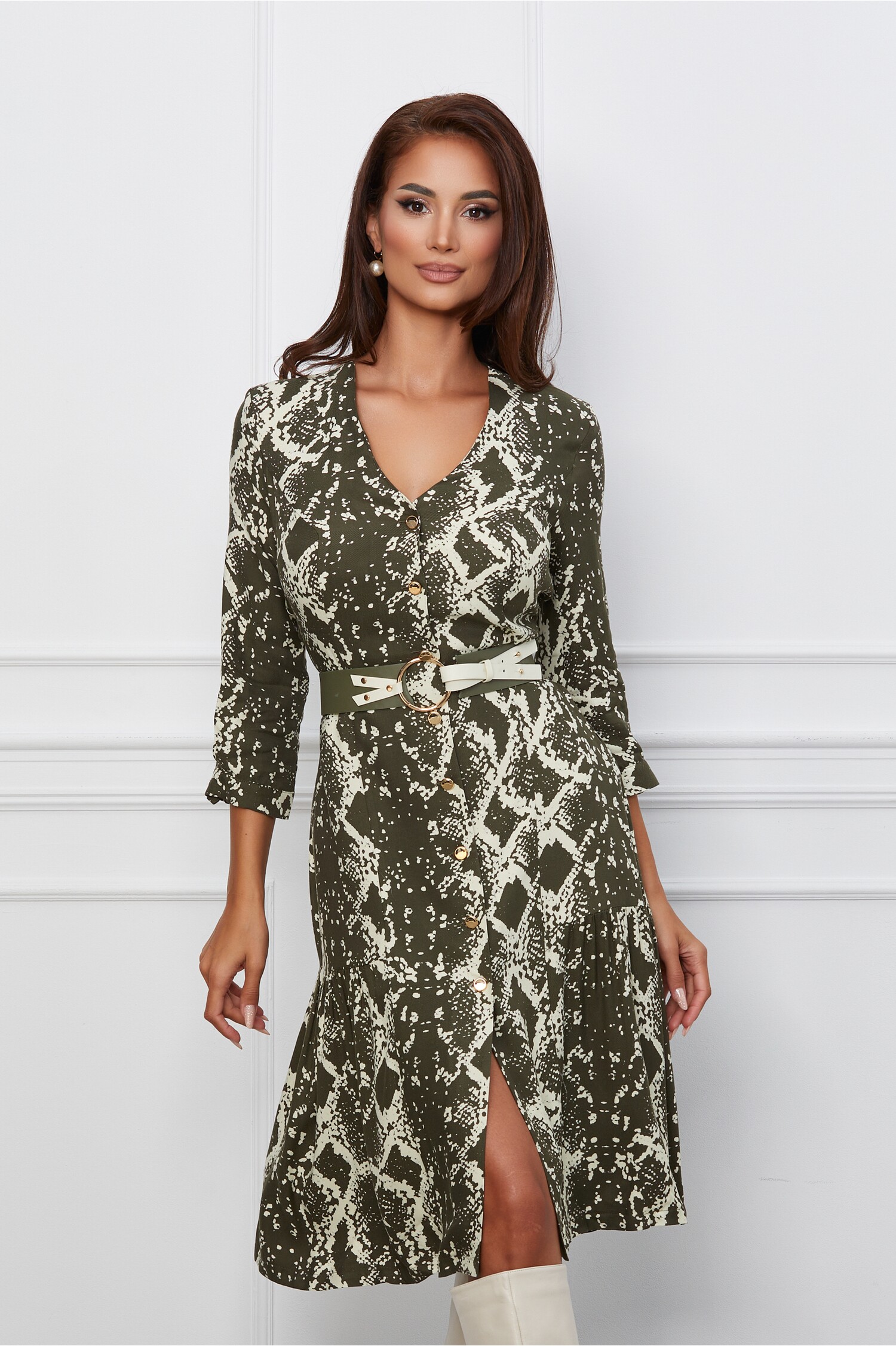 Rochie cu imprimeuri si curea detasabila in talie. Are decolteu in V, maneci lungi, croi cambrat si se inchide cu nasturi. Rochie de zi Decolteu in V Maneci trei sferturi Croi cambrat Curea in talie Fara captuseala Se inchide cu nasturi Material: Viscoza Compozitie: 54% Rayon, 46% Vicoza Instructiuni de intretinere: *Va rugam verificati eticheta produsului inainte de curatare! *Pozitia tiparului imprimeului poate fi diferita datorita taierii. *Modelul are inaltimea de 174 cm. *Va rugam sa retineti ca o usoara discrepanta de culoare ar trebui sa fie acceptabila datorita luminii si luminozitatii ecranului. *Va rugam verificati ghidul de marimi, in cm, pentru a alege corect marimea.
