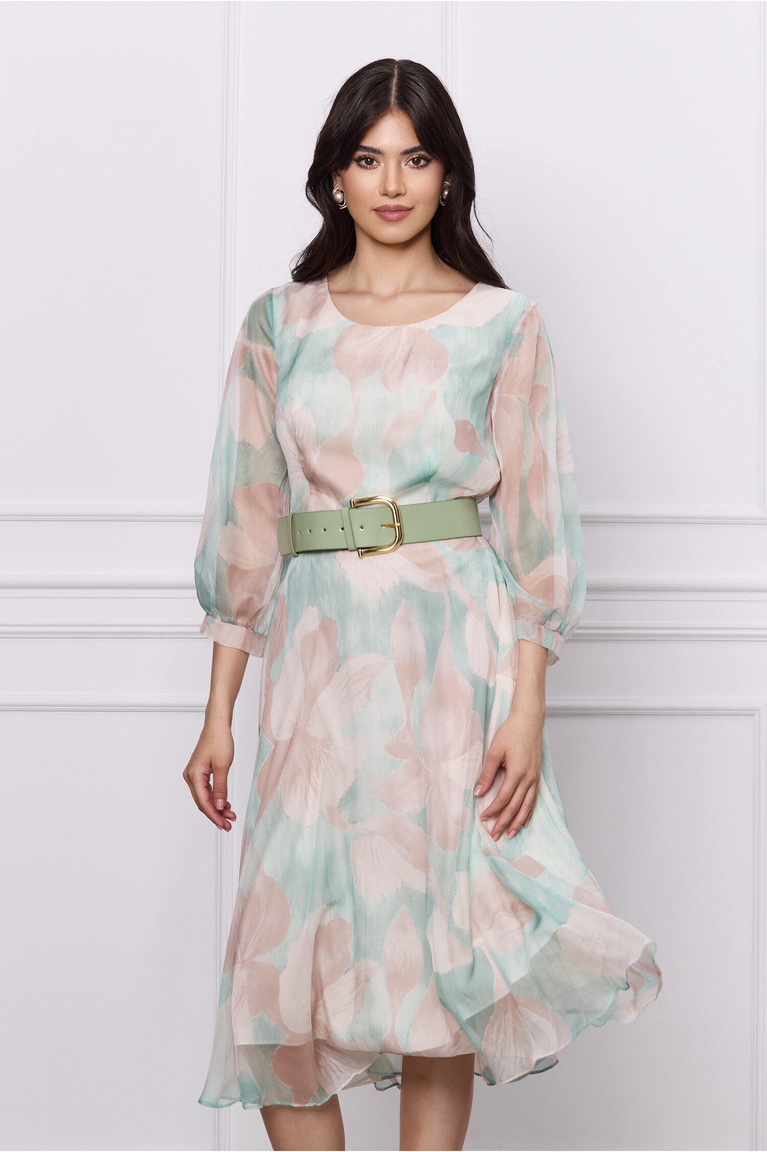 Rochie vaporoasa din voal cu imprimeu si curea detasabila in talie. Are decolteu rotund, maneci trei sferturi si croi clos.  Rochie vaporoasa Decolteu rotund Maneci trei sferturi Croi clos Curea in talie Captusita pe interior Inchidere cu fermoar lateral Material: Voal Compozitie: 100% Poliester *Va rugam verificati eticheta produsului inainte de curatare! *Pozitia tiparului imprimeului poate fi diferita datorita taierii. *Va rugam sa retineti ca o usoara discrepanta de culoare ar trebui sa fie acceptabila datorita luminii si luminozitatii ecranului.   *Va rugam verificati ghidul de marimi, in cm, pentru a alege corect marimea.