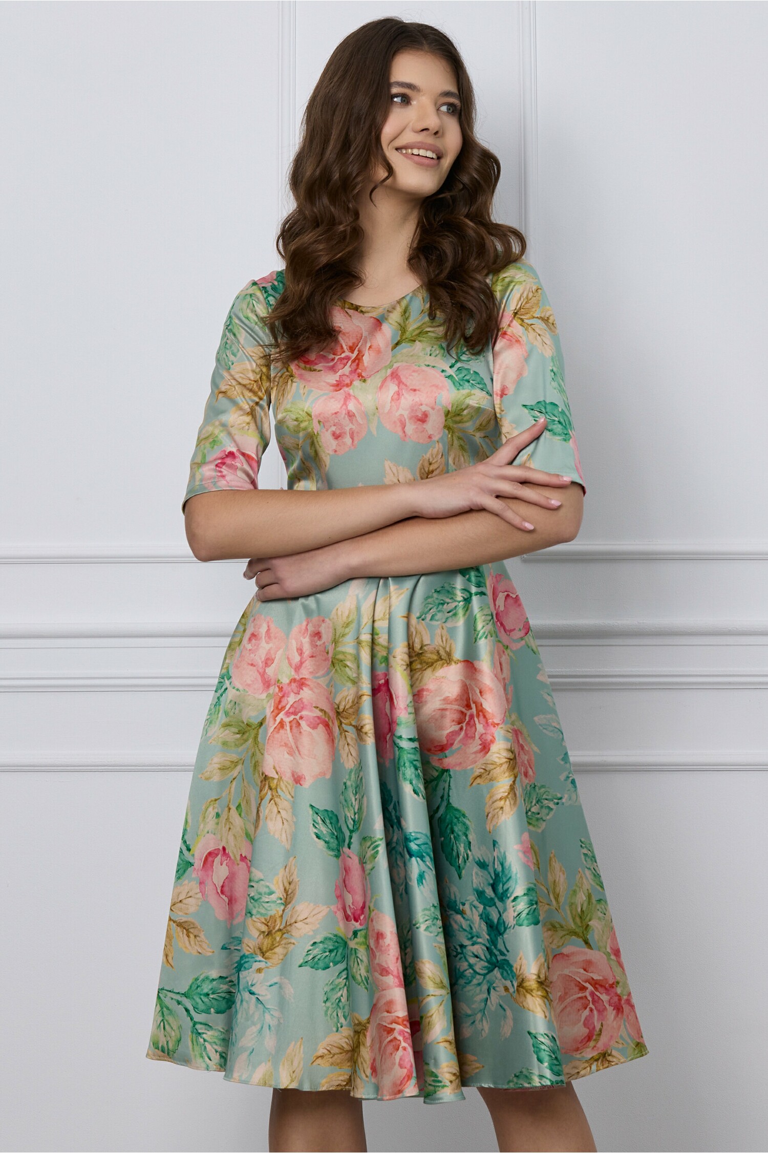 Rochie din satin cu imprimeu. Are decolteu rotund la baza gatului, maneci trei sferturi si croi clos. Se inchide cu fermoar la spate. Rochie de zi Imprimeu Decolteu la baza gatului Maneci trei sferturi Croi clos Buzunare functionale Nu are captuseala Inchidere cu fermoar la spate Material: satin Compozitie: 95% poliester, 5% elastan Instructiuni de intretinere: *Va rugam verificati eticheta produsului inainte de curatare! *Pozitia tiparului imprimeului poate fi diferita datorita taierii. *Modelul are inaltimea de 174 cm. *Va rugam sa retineti ca o usoara discrepanta de culoare ar trebui sa fie acceptabila datorita luminii si luminozitatii ecranului. *Va rugam verificati ghidul de marimi, in cm, pentru a alege corect marimea.