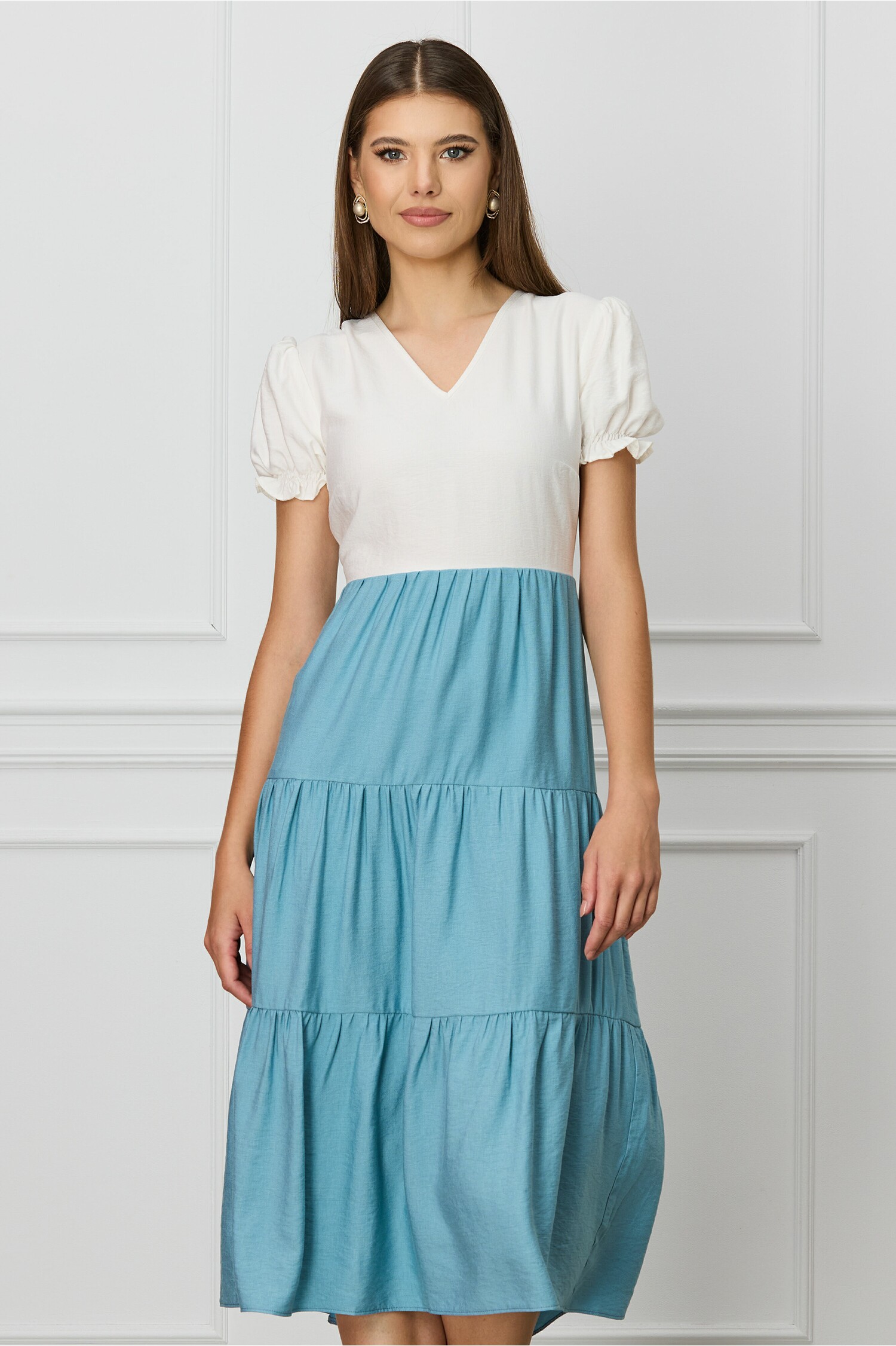 Comandă o Rochie Maria bleu cu alb si volane cu LIVRARE și RETUR GRATUIT!