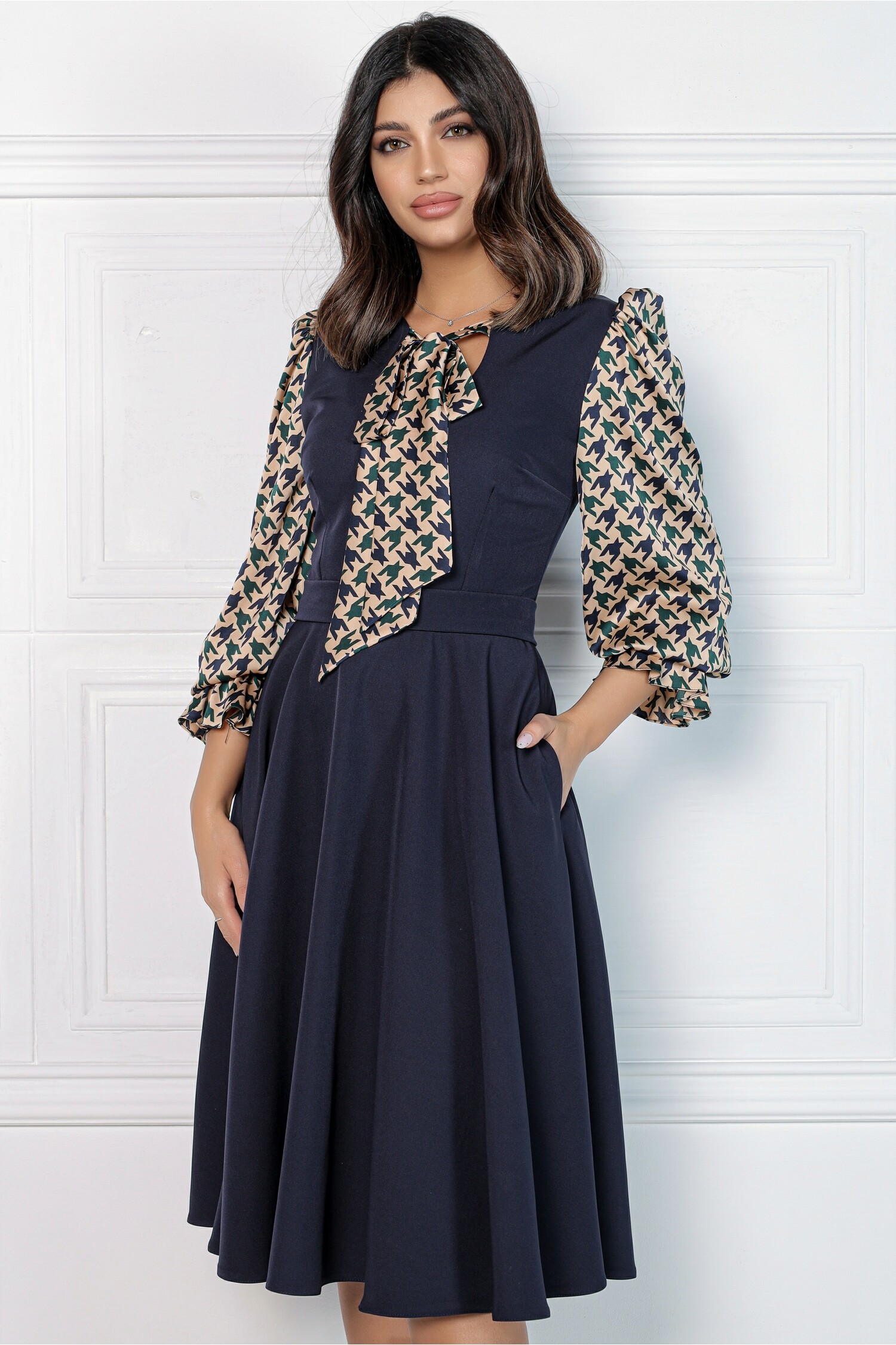 Rochie MBG bleumarin cu imprimeu pe maneci si la decolteu
