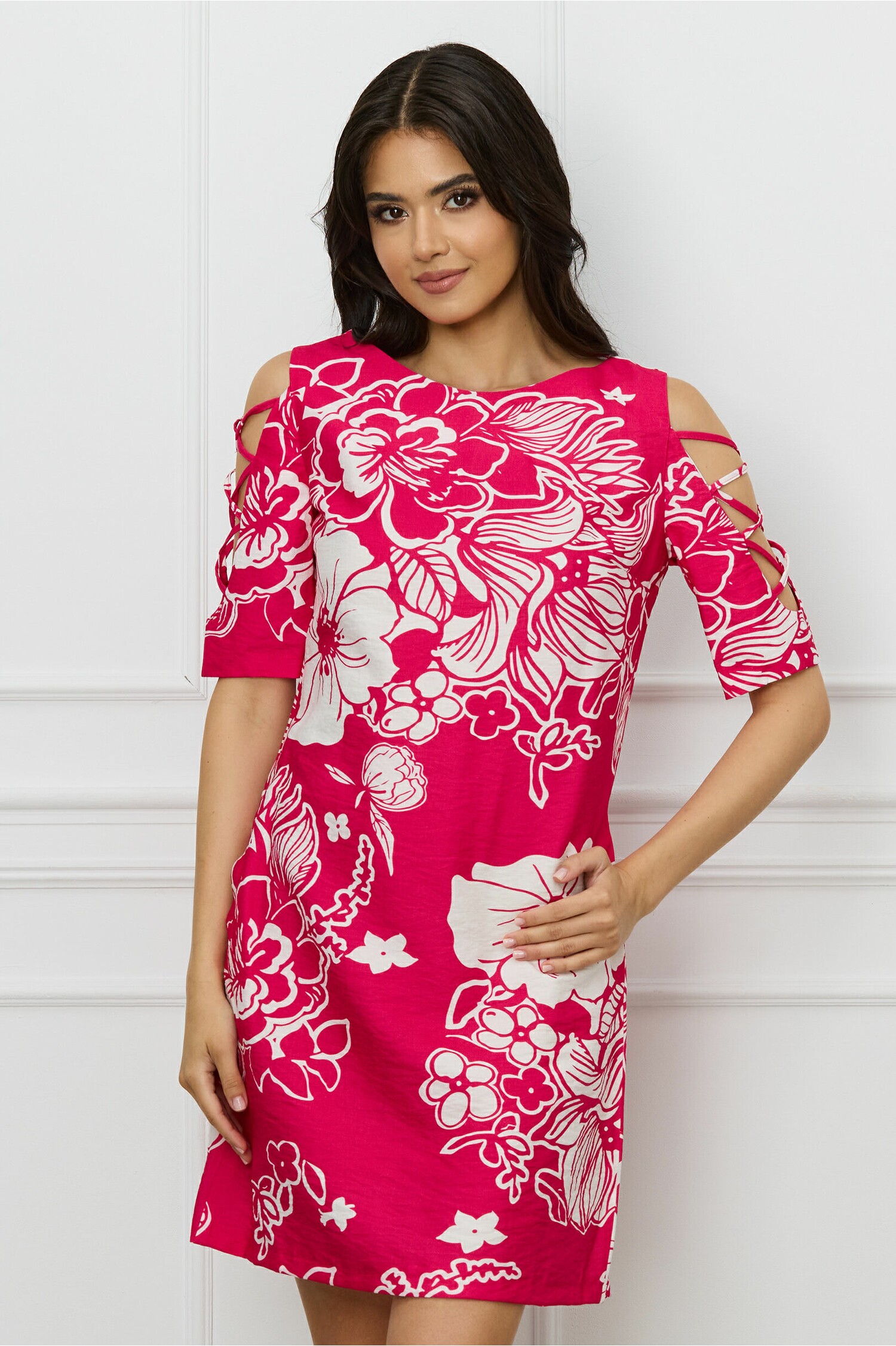 Rochie scurta cu imprimeuri. Are decolteu rotund, maneci scurte cu decupaje, croi cambrat si buzunare functionale. Rochie scurta Decolteu rotund Maneci scurte Croi cambrat Buzunare functionale Fara captuseala Se inchide cu fermoar la spate Material: Panza Compozitie: 95% Poliester, 5% Elastan *Va rugam verificati eticheta produsului inainte de curatare! *Pozitia tiparului imprimeului poate fi diferita datorita taierii. *Modelul are inaltimea de 170 cm. *Va rugam sa retineti ca o usoara discrepanta de culoare ar trebui sa fie acceptabila datorita luminii si luminozitatii ecranului. *Va rugam verificati ghidul de marimi, in cm, pentru a alege corect marimea.