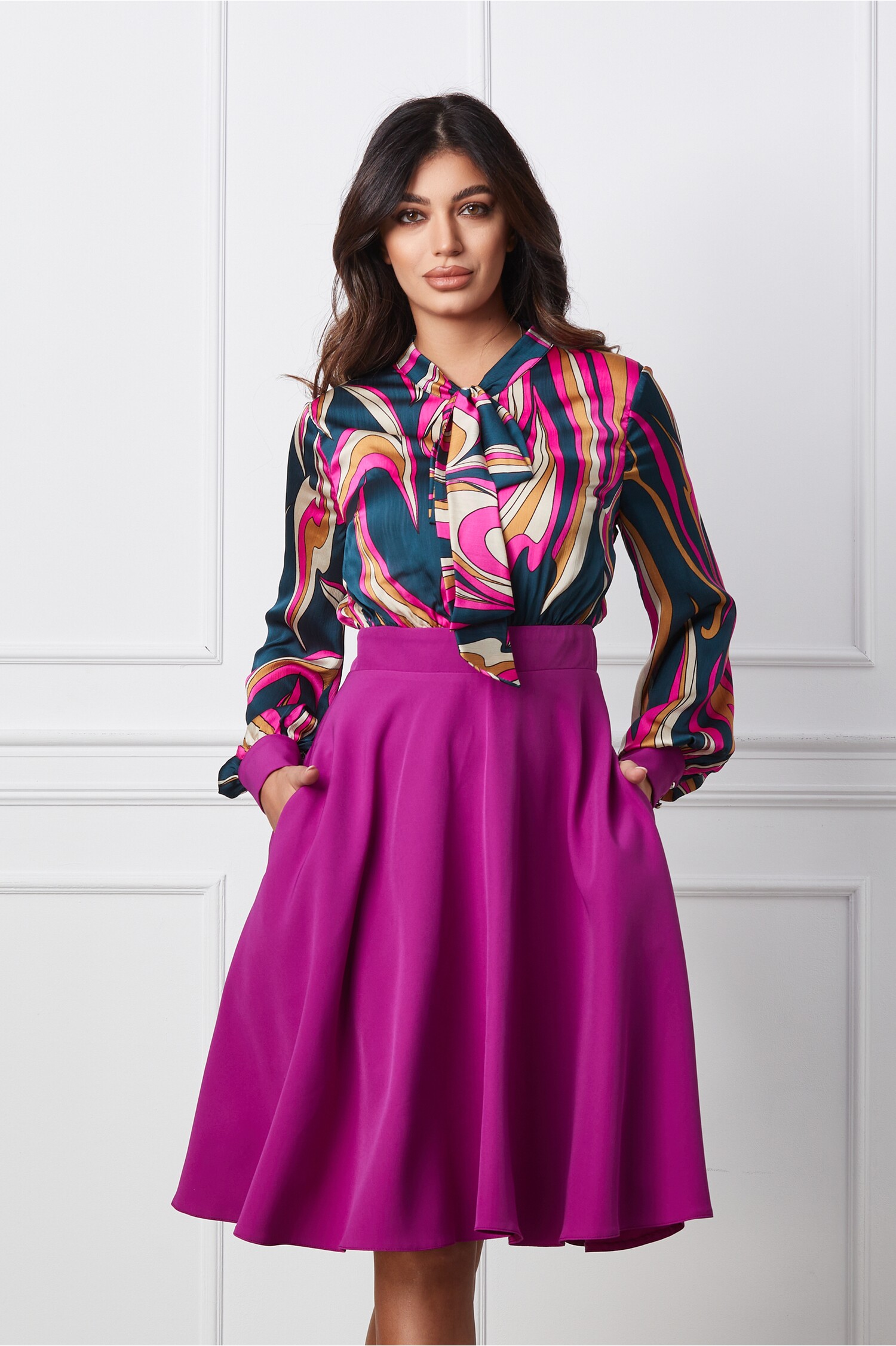 Rochie eleganta cu imprimeu pe bust. Are guler tip esarfa, decolteu in V, maneci lungi, croi clos si buzunare functionale. Rochie eleganta Guler tip esarfa Decolteu in V Maneci lungi Croi clos Buzunare functionale Captusita pe interior Inchidere cu fermoar la spate Material: Stofa, voal Compozitie: 60% Viscoza, 40% Poliester Instructiuni de intretinere: *Va rugam verificati eticheta produsului inainte de curatare! *Pozitia tiparului imprimeului poate fi diferita datorita taierii. *Modelul are inaltimea de 174 cm. *Va rugam sa retineti ca o usoara discrepanta de culoare ar trebui sa fie acceptabila datorita luminii si luminozitatii ecranului. *Va rugam verificati ghidul de marimi, in cm, pentru a alege corect marimea.