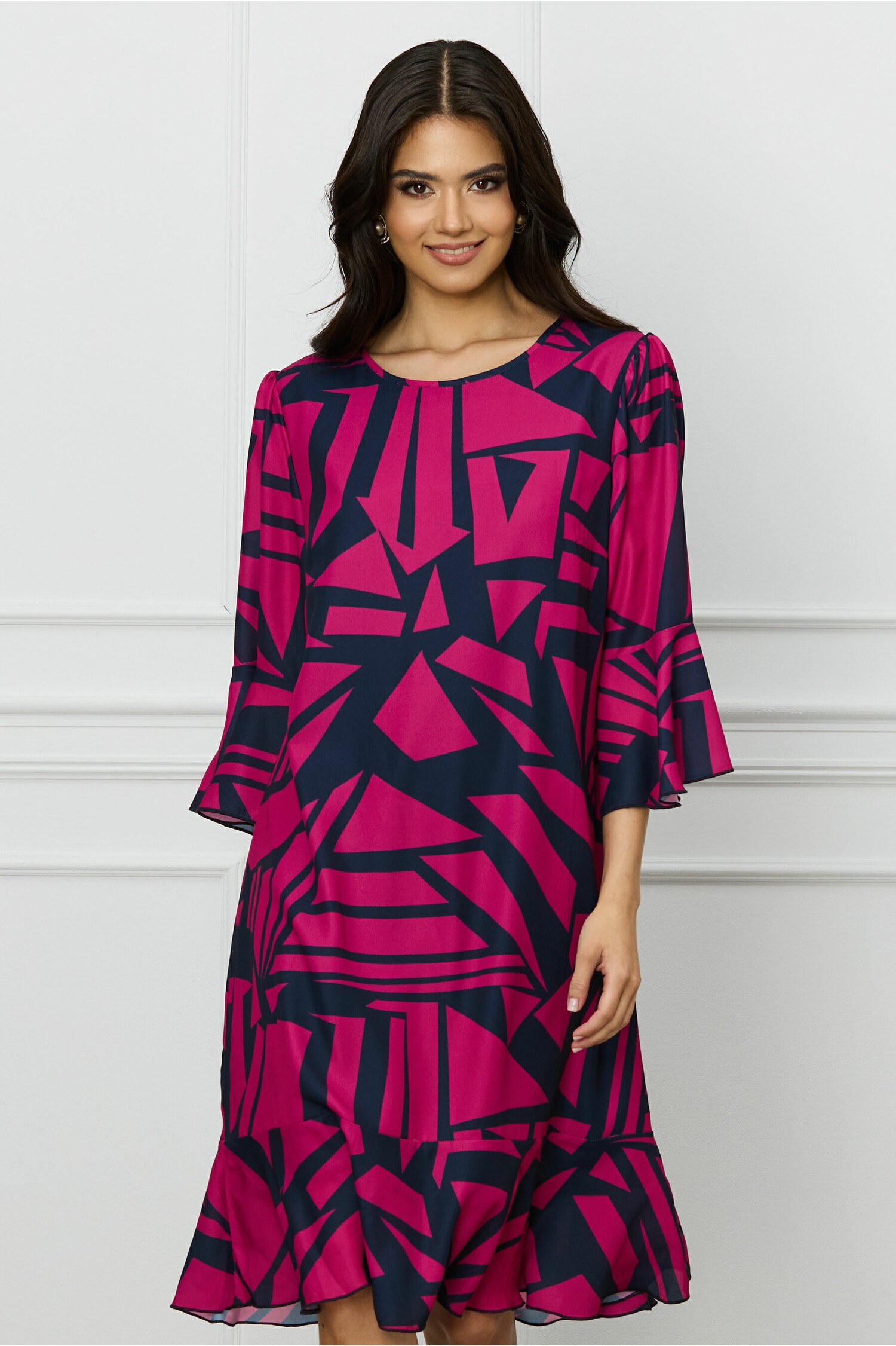 Rochie vaporoasa cu imprimeuri. Are decolteu rotund, maneci trei sferturi cu baza clopot si croi drept. Rochie vaporoasa Decolteu rotund Maneci trei sferturi Croi drept Captusita pe interior Se inchide cu nasture la spate Material: Viscoza Compozitie: 75% Poliester, 25% Viscoza *Va rugam verificati eticheta produsului inainte de curatare! *Pozitia tiparului imprimeului poate fi diferita datorita taierii. *Modelul are inaltimea de 170 cm. *Va rugam sa retineti ca o usoara discrepanta de culoare ar trebui sa fie acceptabila datorita luminii si luminozitatii ecranului. *Va rugam verificati ghidul de marimi, in cm, pentru a alege corect marimea.