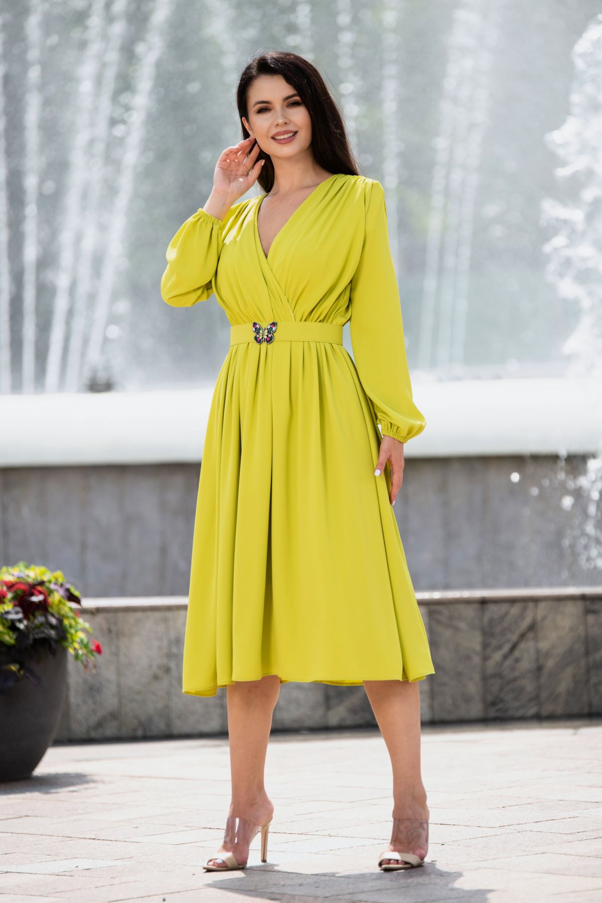 Rochie midi Otilia eleganta olive cu centura in talie ; Culoare: olive ; Croi: clos ; Lungime: midi ; Decolteu in V in fata si in spate ; Material vaporos ; Prezinta dublura ; Maneci lungi cu elastic la terminatie ; Fara sistem de inchidere ; Talie elastica ; Umeri creti ; Fronseuri in zona bustului ; Curea detasabila in talie cu fluture din strassuri ; Compozitie: 100% poliester ; * Echipa noastra face toate eforturile in a prezenta cat mai bine culorile produselor prezentate pe site insa culorile pot diferi de situatia reala si pot varia în functie de setarile monitorului/dispozitivului dvs!