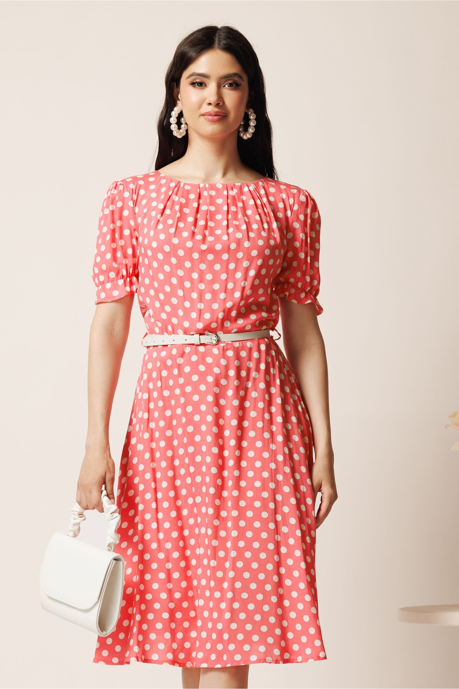 Comandă o Rochie midi roz din viscoza in clos cu buline si curea in talie cu LIVRARE și RETUR GRATUIT!