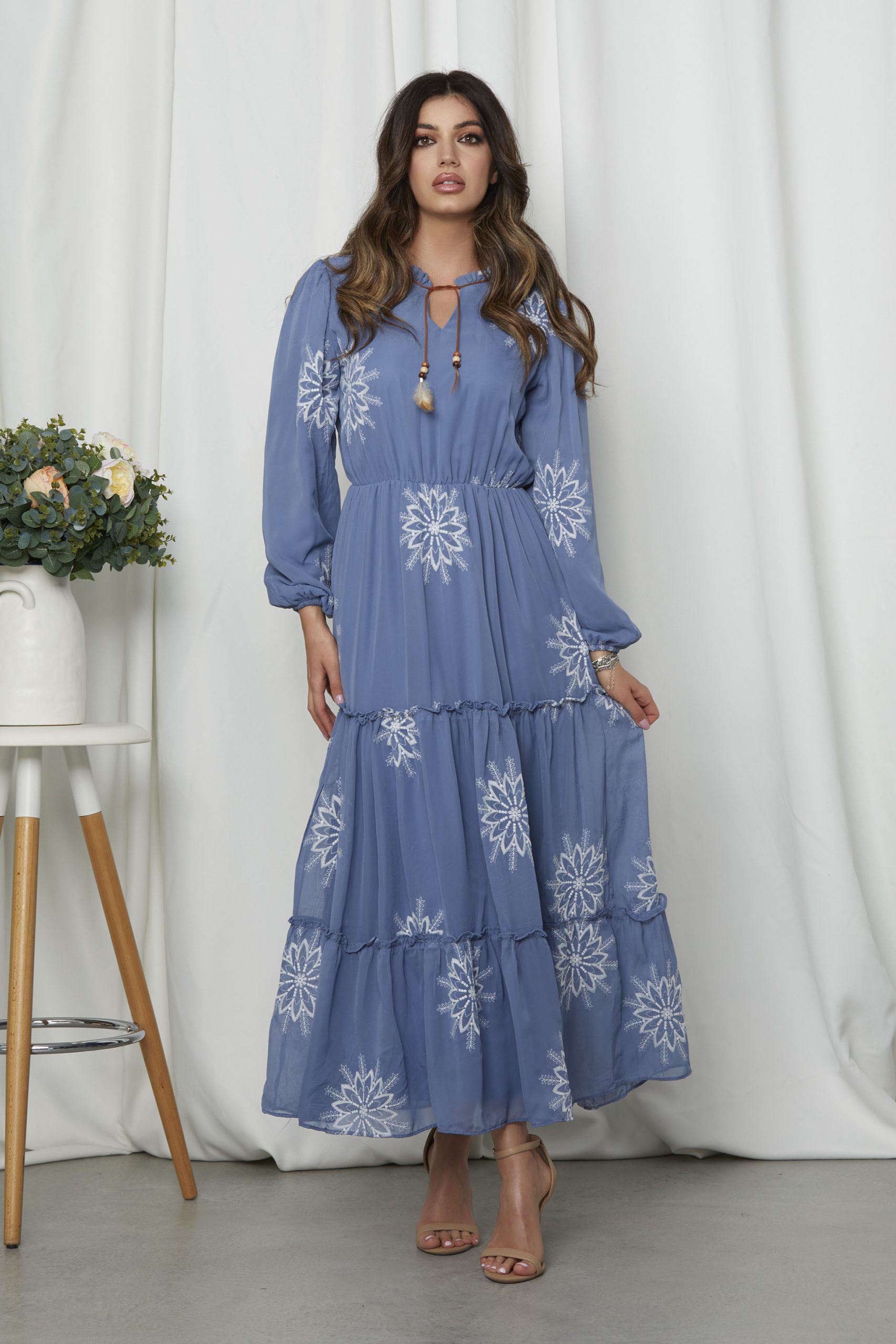 Rochie lunga albastra cu broderie, croi lejer si maneci lungi perfecta pentru multe ocazii. Este o combinatie de clasic si modern perfecta atat pentru tinute elegante de zi cat si de seara. material neelastic fara fermoar elastic in talie maneci lungi broderie jupon Dimensiuni disponibile: M, L, XL, XXL