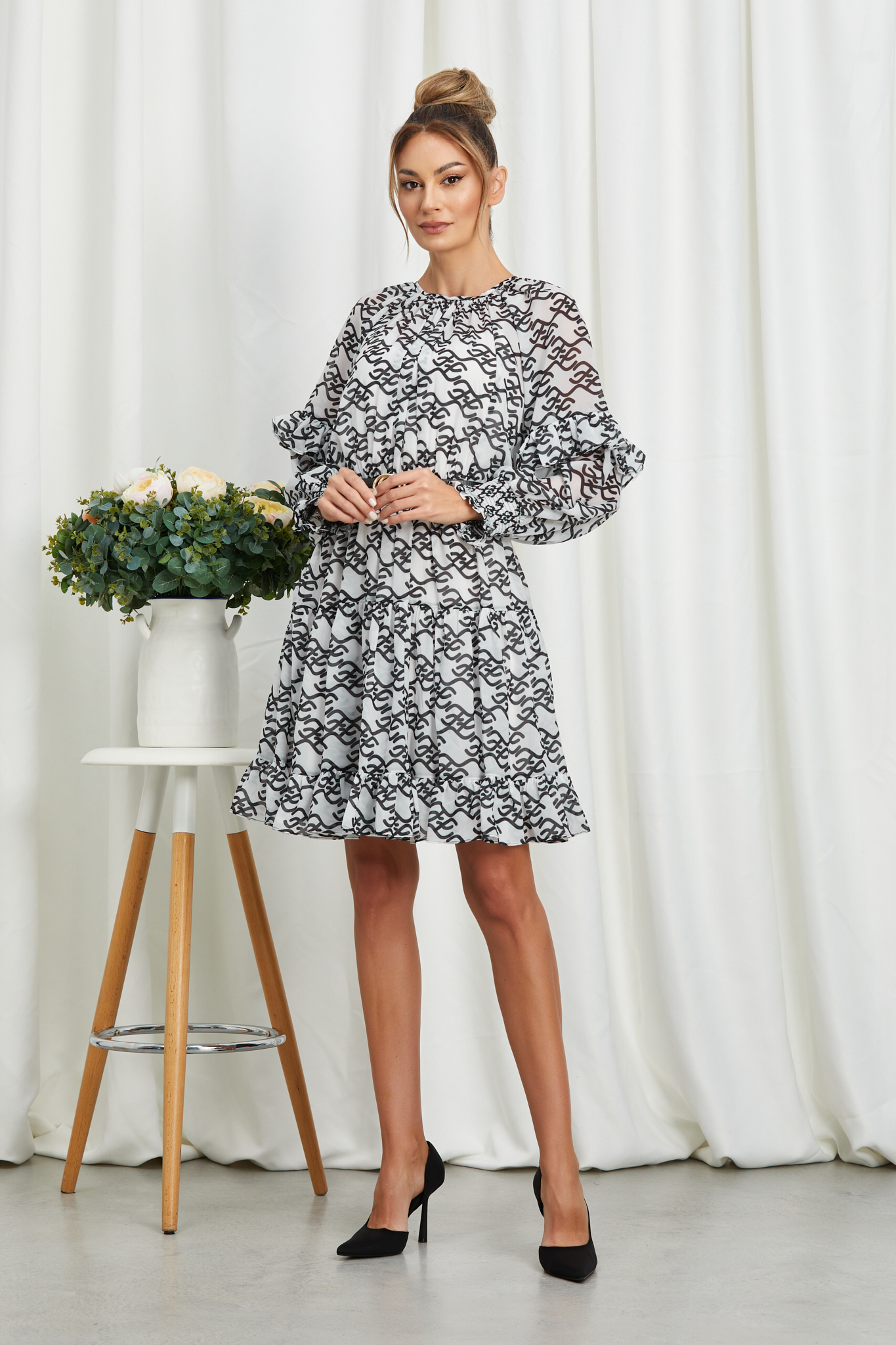 Rochie scurta casual-eleganta din voal alb cu imprimeu negru, perfecta pentru iesirile cu prietenii. material neelastic se inchide cu un nasture la spate maneci lungi elastic si curea in talie dublata de jupon detasabil Dimensiuni disponibile: S, M, L, XL