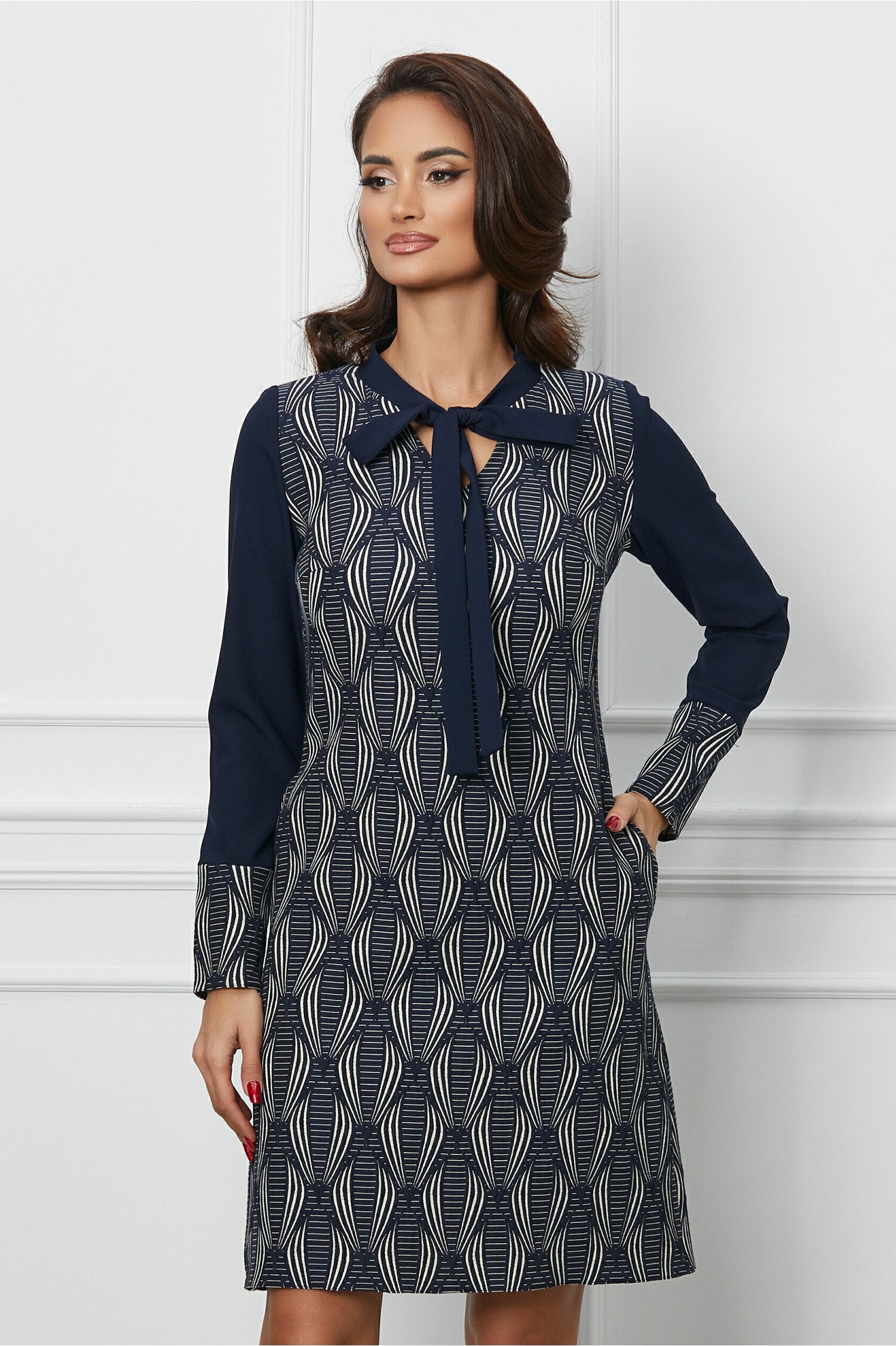 Rochie de zi cu imprimeuri. Are guler tip esarfa, decolteu in V, maneci lungi, croi cambrat si buzunare functionale. Rochie de zi Guler tip esarfa Maneci lungi Croi cambrat Buzunare functionale Captusita pe interior Inchidere cu fermoar la spate Material: Jacard Compozitie: 100% Poliester Instructiuni de intretinere: *Va rugam verificati eticheta produsului inainte de curatare! *Pozitia tiparului imprimeului poate fi diferita datorita taierii. *Modelul are inaltimea de 174 cm. *Va rugam sa retineti ca o usoara discrepanta de culoare ar trebui sa fie acceptabila datorita luminii si luminozitatii ecranului. *Va rugam verificati ghidul de marimi, in cm, pentru a alege corect marimea.