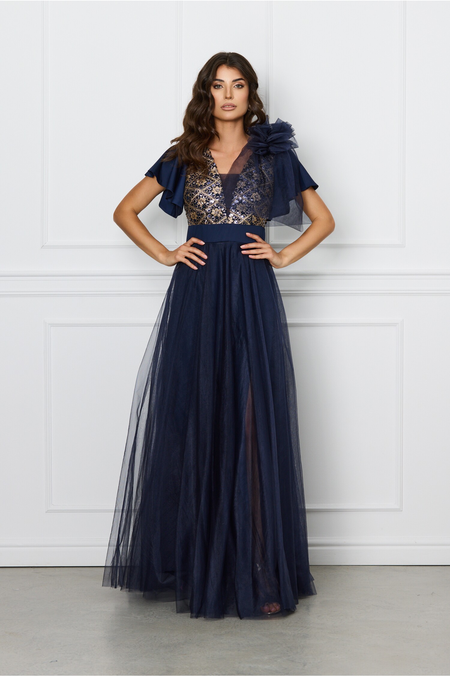 Rochie lunga eleganta cu paiete la bust. Are decolteu in V, maneci scurte si croi clos. Rochie lunga eleganta Decolteu in V Maneci scurte Croi clos Captusita pe interior Inchidere cu fermoar la spate Material: Tull, paiete Compozitie: 96% Poliester, 4% Elastan *Va rugam verificati eticheta produsului inainte de curatare! *Pozitia tiparului imprimeului poate fi diferita datorita taierii. *Va rugam sa retineti ca o usoara discrepanta de culoare ar trebui sa fie acceptabila datorita luminii si luminozitatii ecranului.   *Va rugam verificati ghidul de marimi, in cm, pentru a alege corect marimea.