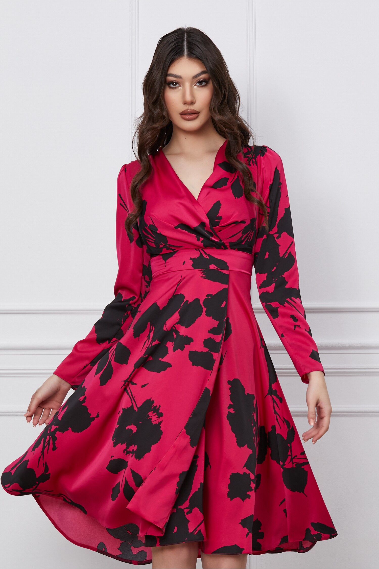 Rochie eleganta din satin cu imprimeuri. Are decolteu in V petrecut, maneci lungim croi clos si fusta petrecuta. Rochie eleganta Decolteu in V petrecut Maneci lungi Croi clos Fusta petrecuta Captusita la bust Se inchide cu fermoar la spate Material: Satin Compozitie: 96% Poliester, 4%Spandex *Va rugam verificati eticheta produsului inainte de curatare! *Pozitia tiparului imprimeului poate fi diferita datorita taierii. *Modelul are inaltimea de 179 cm. *Va rugam sa retineti ca o usoara discrepanta de culoare ar trebui sa fie acceptabila datorita luminii si luminozitatii ecranului. *Va rugam verificati ghidul de marimi, in cm, pentru a alege corect marimea.