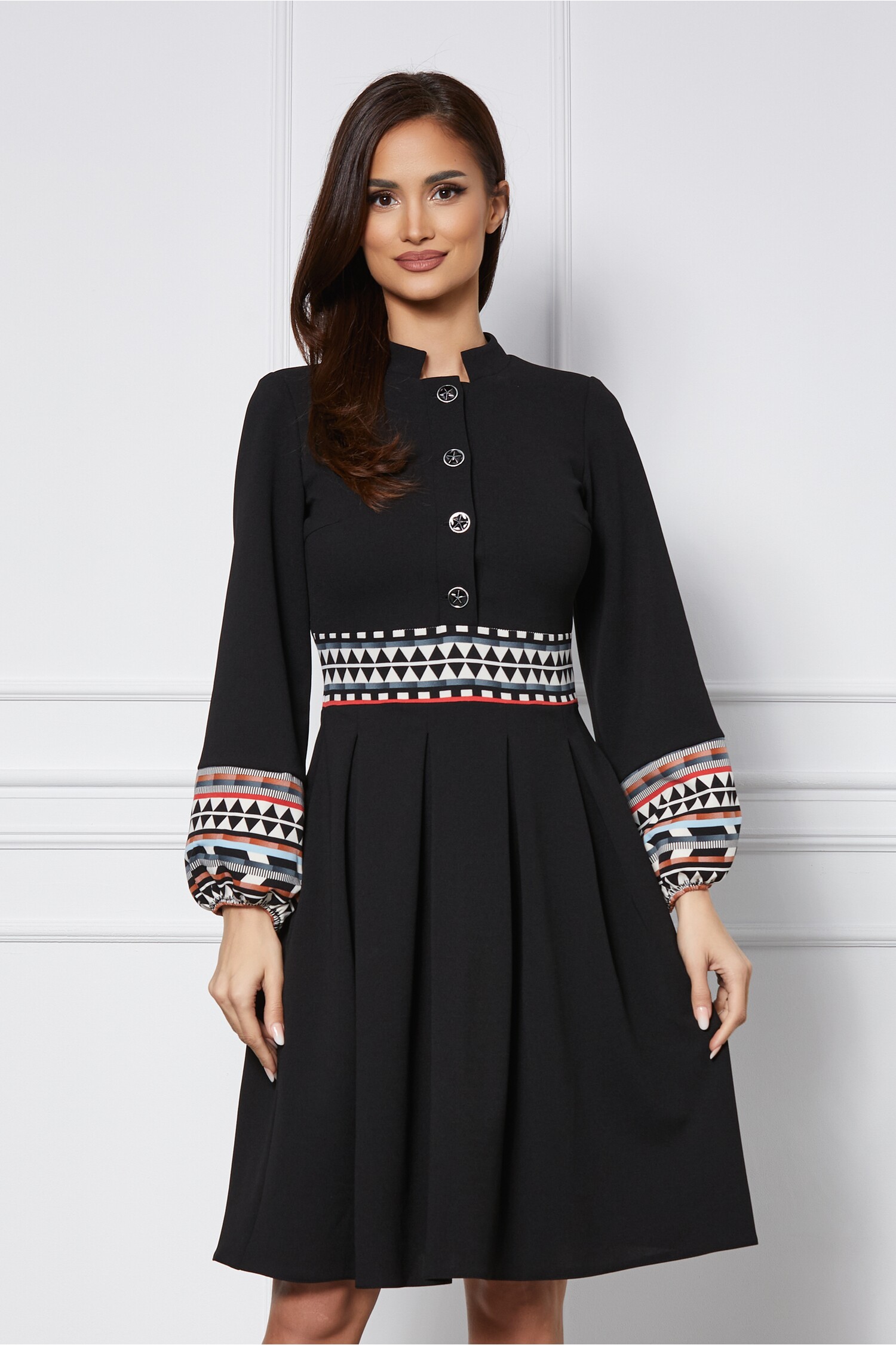 Rochie office cu nasturi la bust si imprimeu in talie. Are guler tip tunica, maneci lungi si croi clos. Rochie office Guler tip tunica Nasturi la bust Maneci lungi Croi clos Captusita pe interior Inchidere cu fermoar la spate Material: Crep Compozitie: 95% Poliester, 5% Spandex Instructiuni de intretinere: *Va rugam verificati eticheta produsului inainte de curatare! *Pozitia tiparului imprimeului poate fi diferita datorita taierii. *Modelul are inaltimea de 174 cm. *Va rugam sa retineti ca o usoara discrepanta de culoare ar trebui sa fie acceptabila datorita luminii si luminozitatii ecranului. *Va rugam verificati ghidul de marimi, in cm, pentru a alege corect marimea.