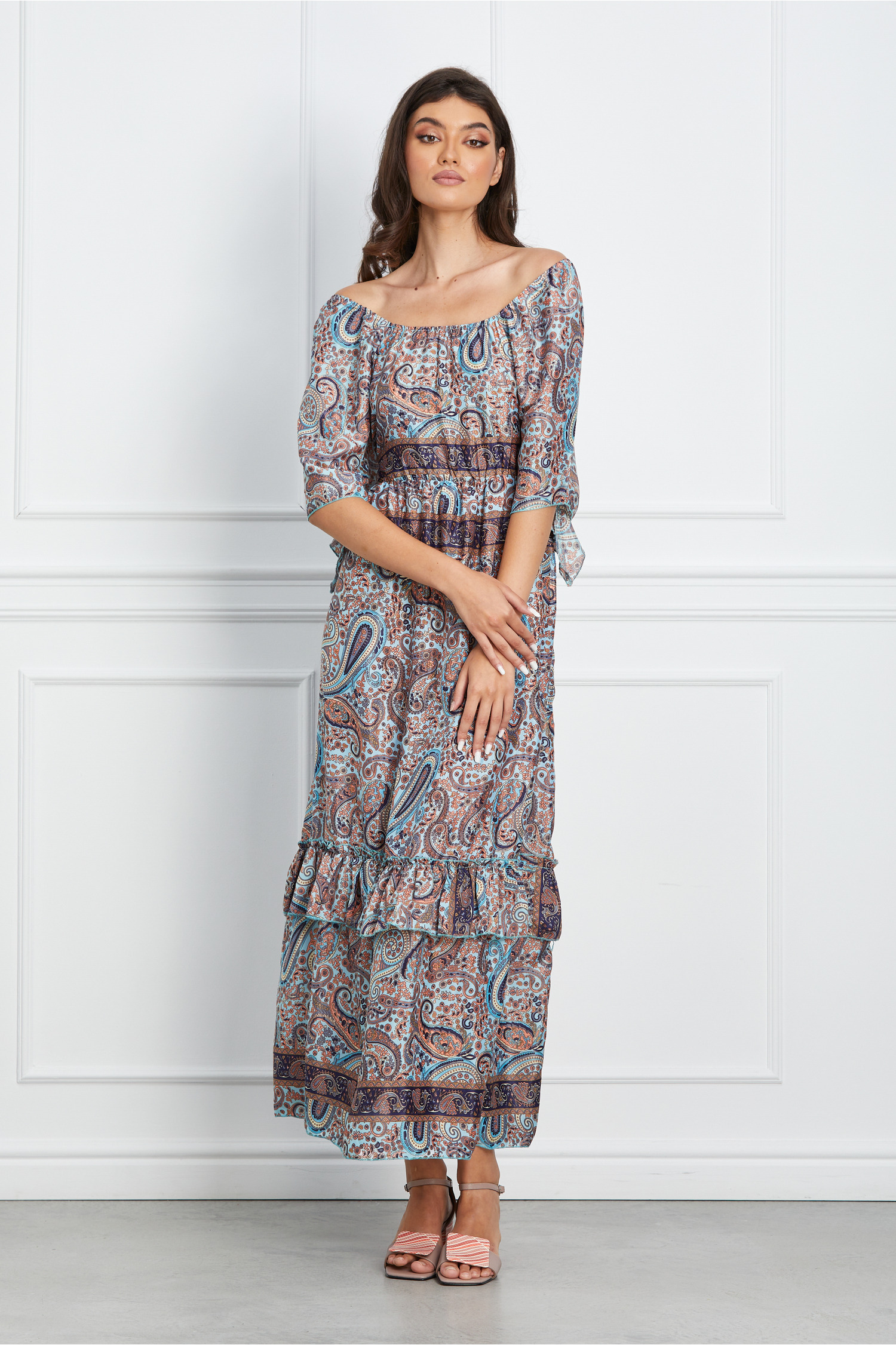 Rochie vaporoasa cu imprimeuri si cordon nedetasabil in talie. Are elastic la decolteu si umeri, maneci scurte vaporoase si croi clos cu elastic in talie. Rochie vaporoasa Elastic la decolteu Maneci scurte Croi clos Elastic si cordon in talie Volane la baza Fara captuseala Material: Voal satinat *Va rugam verificati eticheta produsului inainte de curatare! *Pozitia tiparului imprimeului poate fi diferita datorita taierii. *Modelul are inaltimea de 174 cm. *Va rugam sa retineti ca o usoara discrepanta de culoare ar trebui sa fie acceptabila datorita luminii si luminozitatii ecranului. *Va rugam verificati ghidul de marimi, in cm, pentru a alege corect marimea.