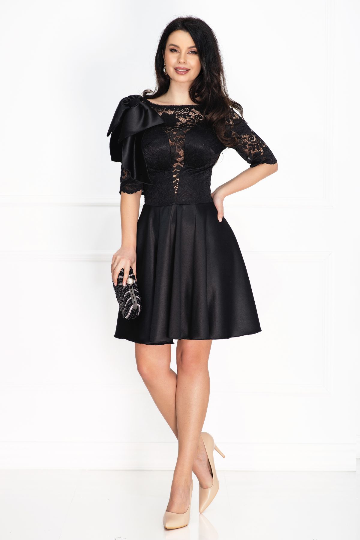 Rochie neagra de ocazie in clos cu funda pe umar ; Culoare: negru ; Textura: dantela tafta ; Maneci scurte ; Partea de sus din dantela elastica ; Cupe cu push-up ; Decolteu rotund ; Inchidere cu fermoar la spate ; Fusta in clos din tafta ; Fara dublura ; Funda maxi pe umar ; Compozitie: 95% poliester 5% elastan ; Fabricat in Romania ; * Echipa noastra face toate eforturile in a prezenta cat mai bine culorile produselor prezentate pe site insa culorile pot diferi de situatia reala si pot varia în functie de setarile monitorului/dispozitivului dvs!