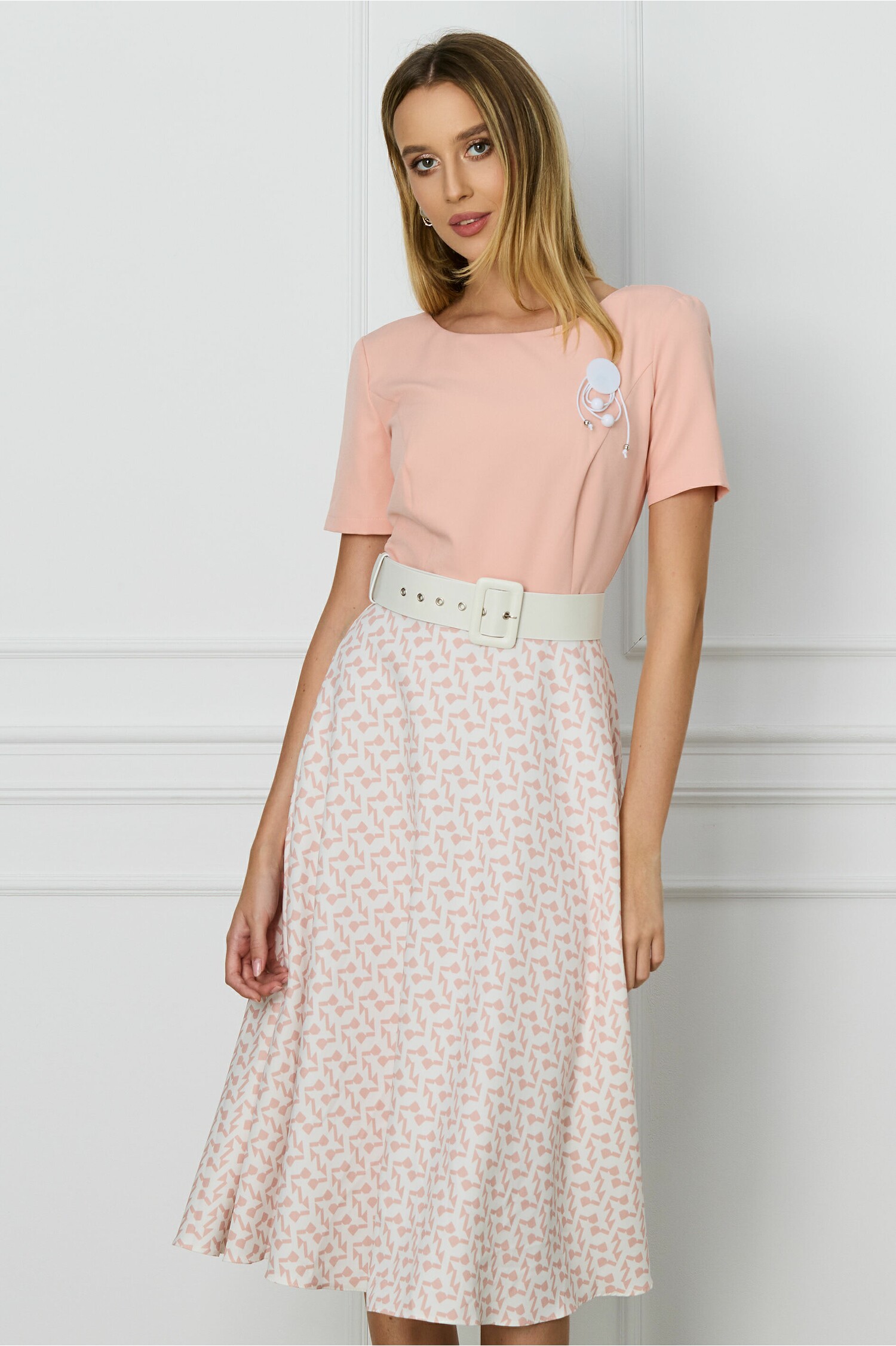 Rochie Nico roz cu imprimeu pe fusta si curea in talie