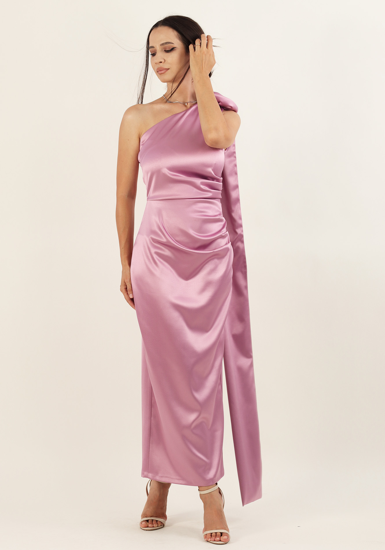 Rochie pe un umar,trandafir decorativ cu esarfa,bustul cu pliuri in lateral pe o parte,taiata in talie,fusta conica cu pliuri in lateral pe o parte si crepeu la spate,captusita la bust,inchidere la spate cu fermoar ascuns.Material tafta elastica