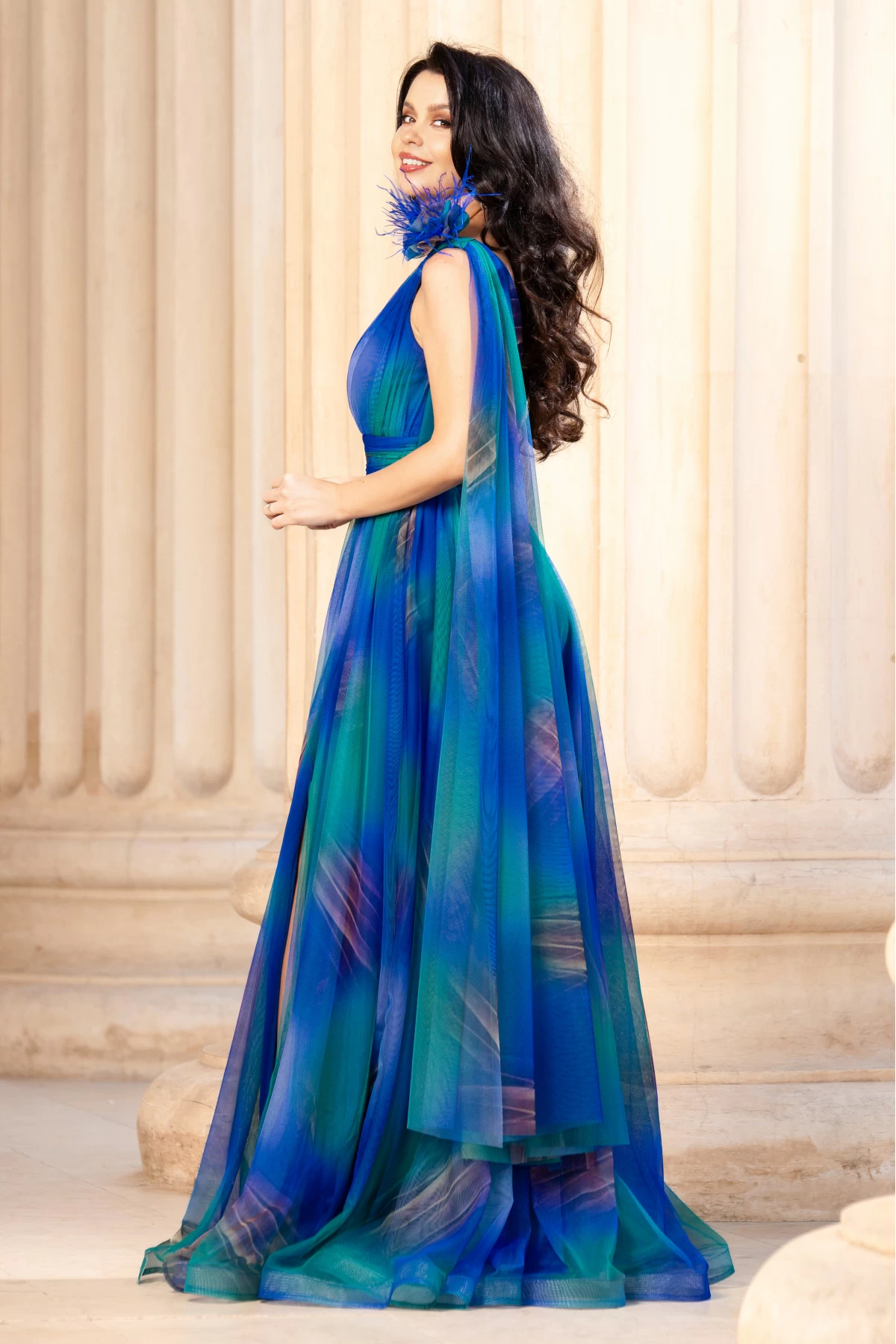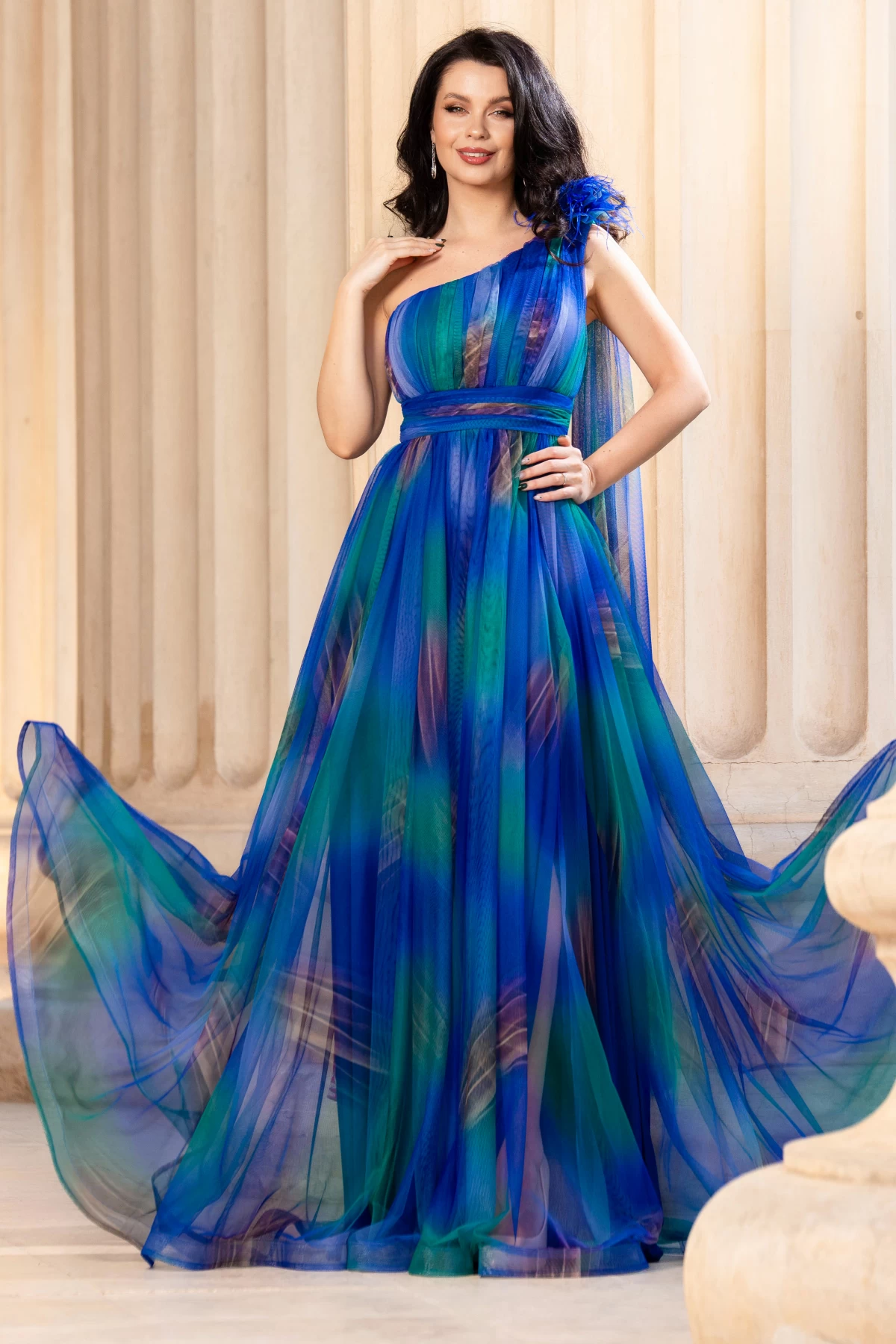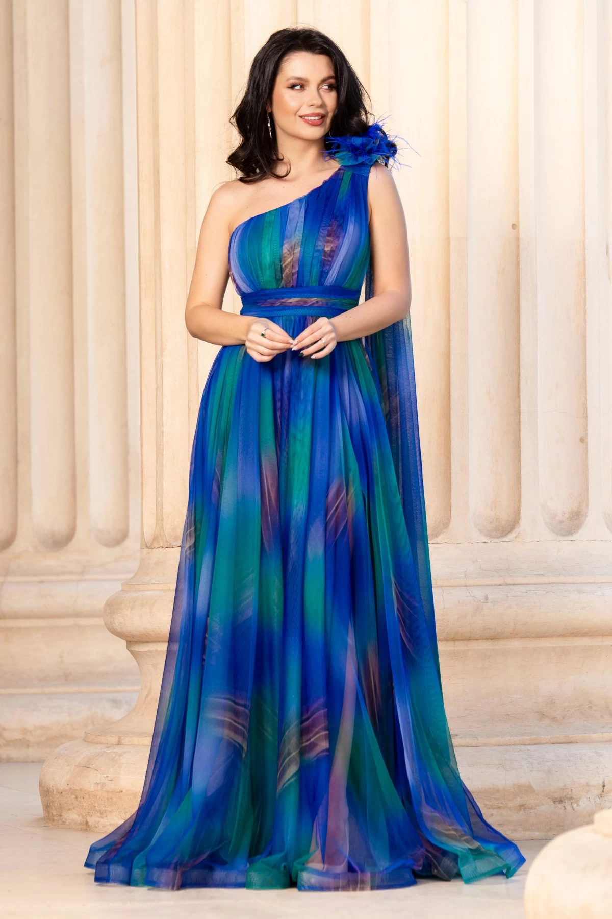 Rochie pretioasa Josephine cu imprimeu in culorile paunului ; Culoare: albastru verde bej ; Croi: clos printesa ; Maneca tip trena pe o parte ; Decolteu asimetric ; Banda antiaderenta in partea de sus ; Bretele transparente pentru sustinere ; Floare 3D cu fulgi pe umar ; Bust buretat ; Imprimeu tip pictura in degrade ; Rochie cu rejansa in partea de jos pentru volum ; Inchidere cu fermoar la spate ; Talie marcata cu banda lata ; Compozitie: 100% poliester ; * Echipa noastra face toate eforturile in a prezenta cat mai bine culorile produselor prezentate pe site insa culorile pot diferi de situatia reala si pot varia în functie de setarile monitorului/dispozitivului dvs!