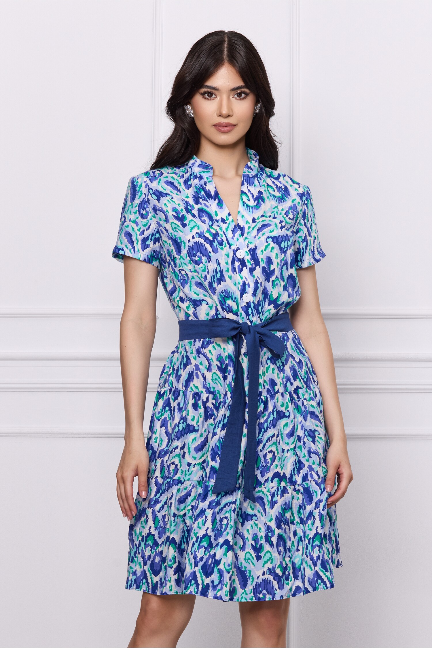 Rochie de zi cu imprimeuri si cordon detsabil in talie. Are guler tip tunica, decolteu in V, nasturi la bust, maneci scurte si croi evazat. Rochie de zi Guler tip tunica Decolteu in V Nasturi la bust Maneci scurte Croi evazat Fara captuseala Material: Viscoza Compozitie: 100% Viscoza *Va rugam verificati eticheta produsului inainte de curatare! *Pozitia tiparului imprimeului poate fi diferita datorita taierii. *Va rugam sa retineti ca o usoara discrepanta de culoare ar trebui sa fie acceptabila datorita luminii si luminozitatii ecranului. *Va rugam verificati ghidul de marimi, in cm, pentru a alege corect marimea.
