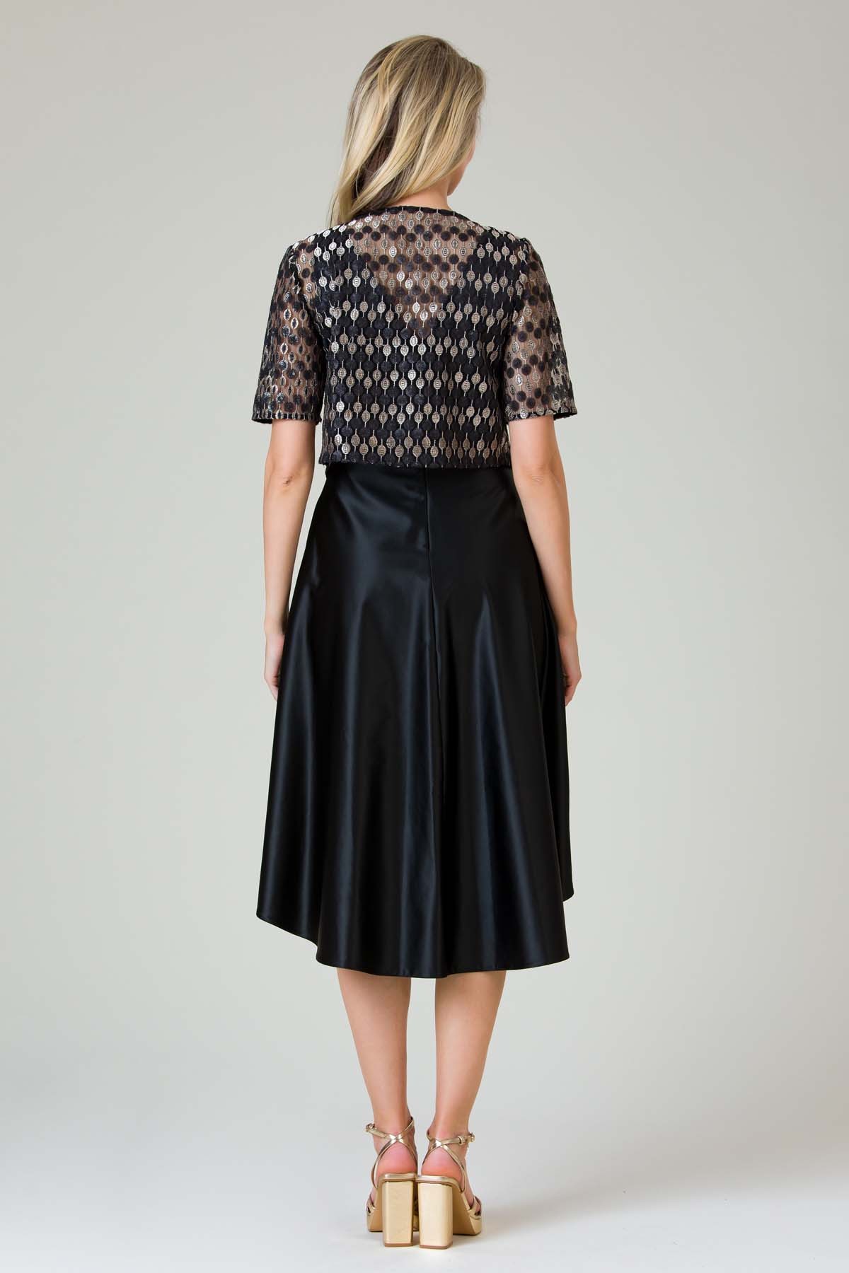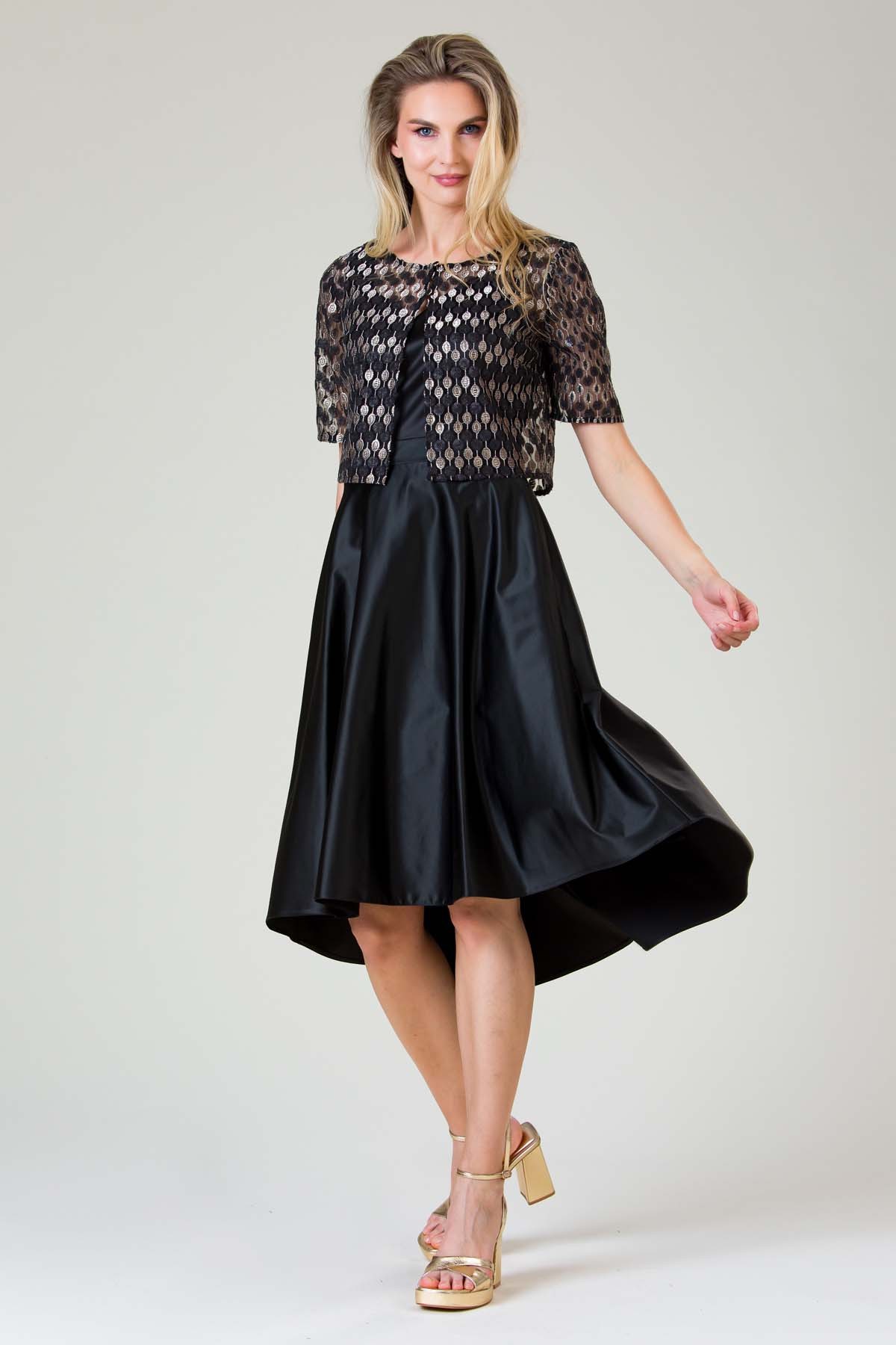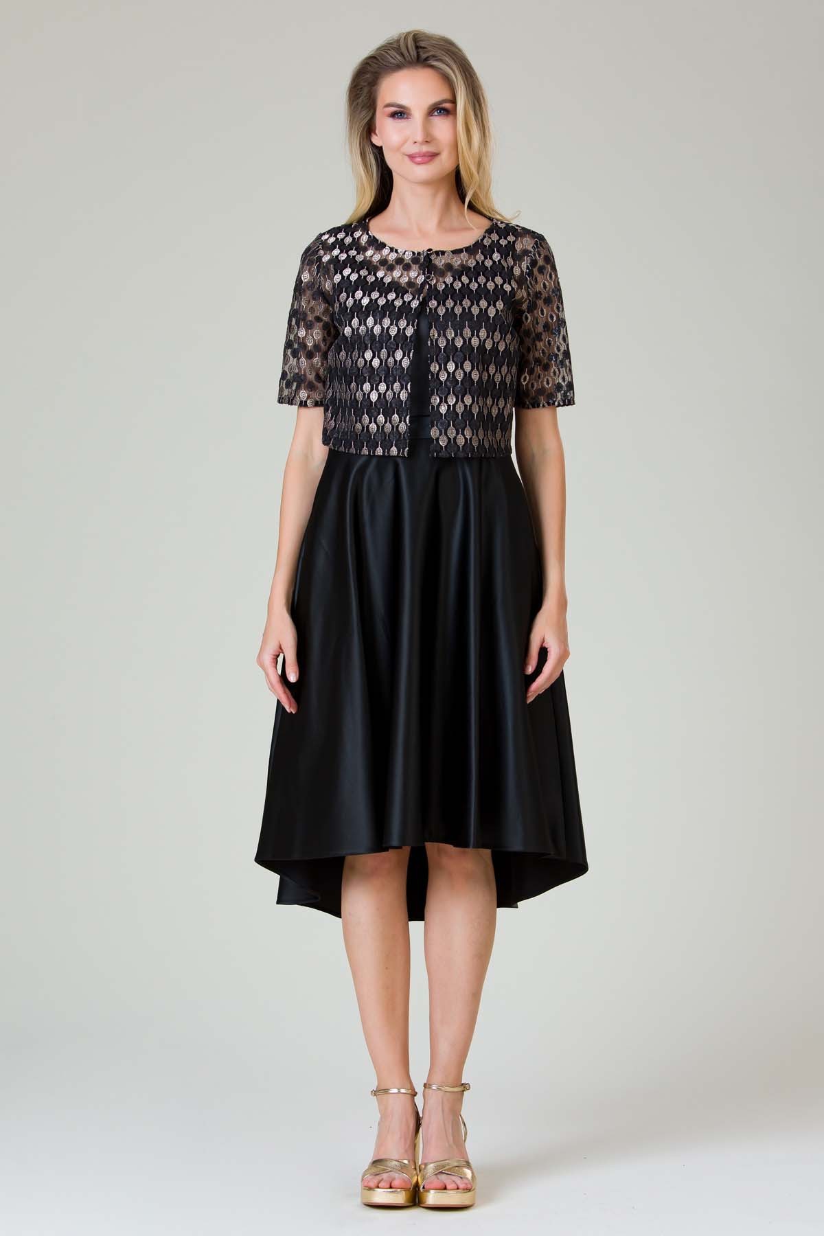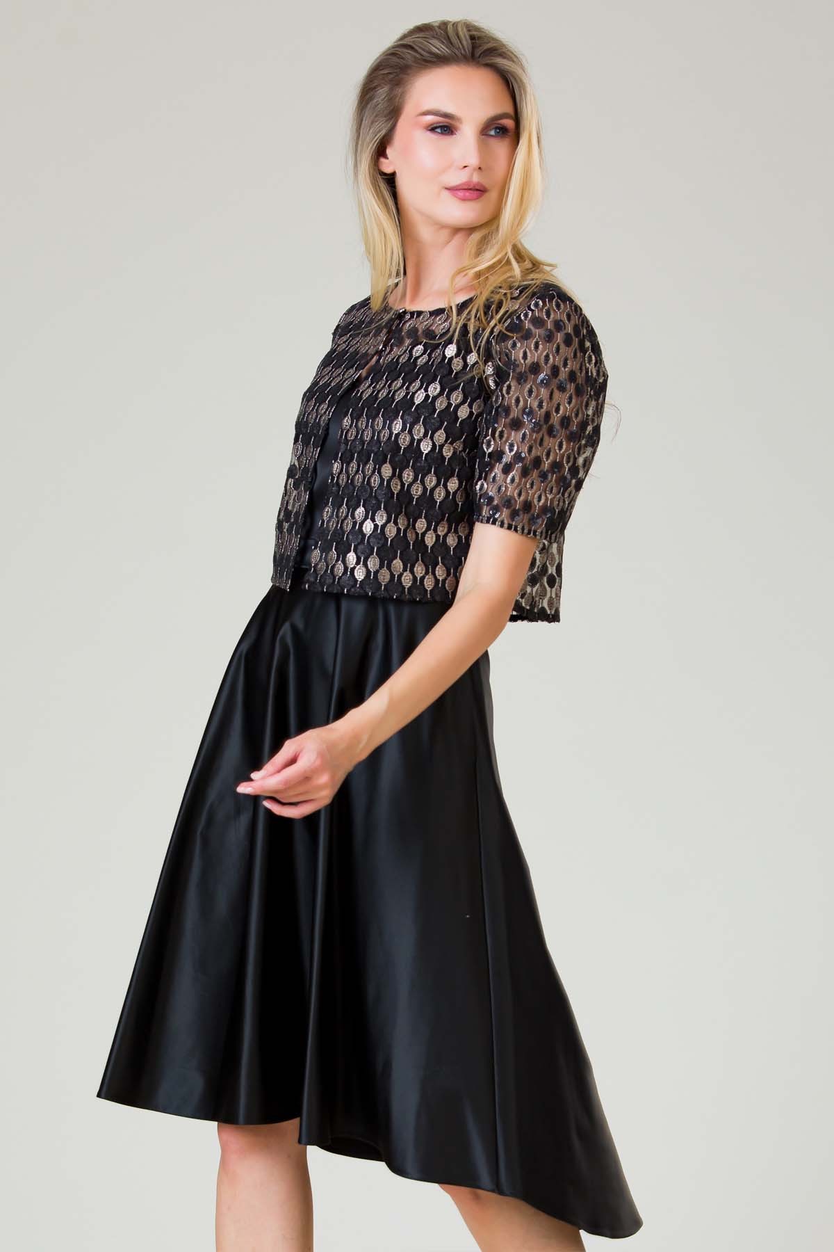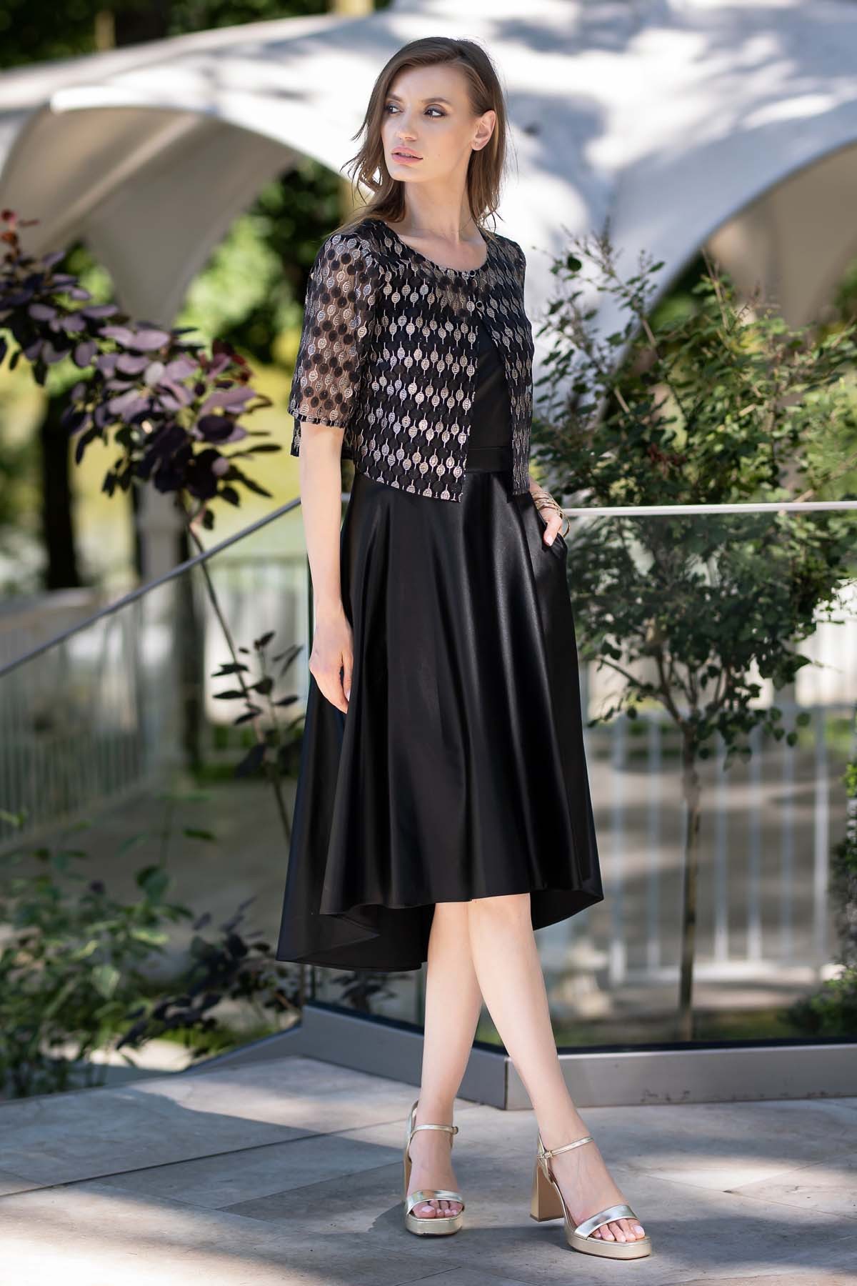 Rochie Anne din material satinat, croi feminin cu buzunare laterale, terminatie asimetrica si bolerou din dantela cu paiete, inchis cu doi nasturi metalici.
