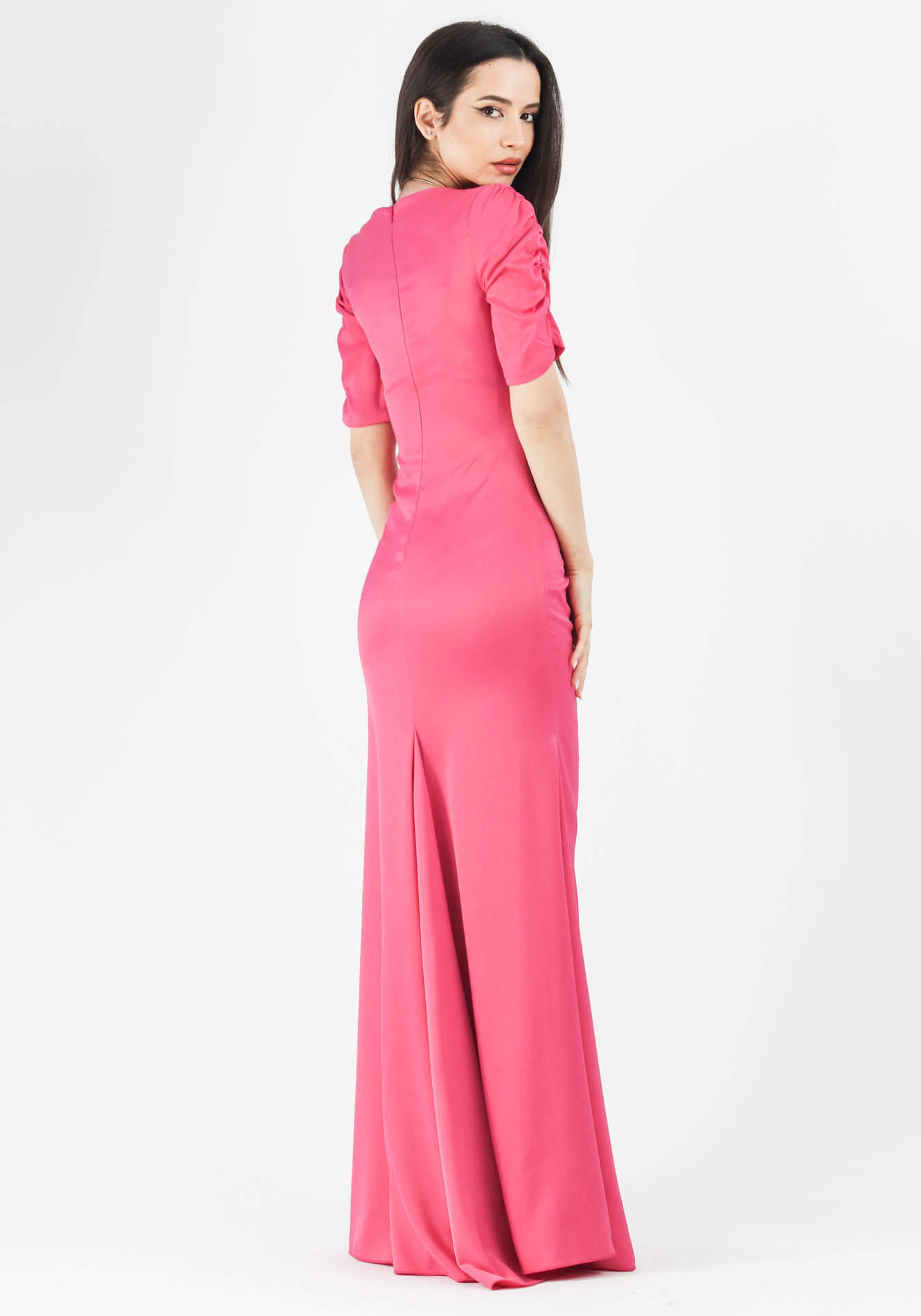 Rochie cu decolteu tip V in fata si rotund in spate,maneca scurta cu cret pe mijloc,taiata pe mijlocul fetei cu cret in zona bustului si crepeu,fara captusala,inchidere la spate cu fermoar ascuns