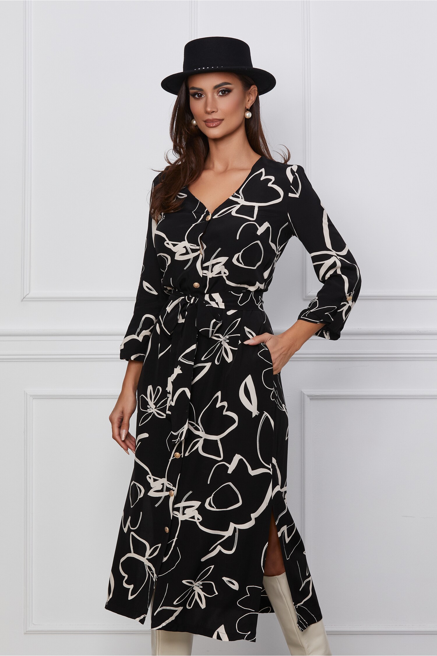 Rochie casual tip camasa cu imprimeu si cordon detasabil in talie. Are decolteu rotund, maneci trei sferturi, croi drept si se inchide cu nasturi in fata. Rochie tip camasa Decolteu rotund Maneci trei sferturi Croi drept Buzunare functionale Cordon in talie Crepeuri la baza Fara captuseala Se inchide cu nasturi pe fata Material: Viscoza Compozitie: 100% Viscoza Instructiuni de intretinere: *Va rugam verificati eticheta produsului inainte de curatare! *Pozitia tiparului imprimeului poate fi diferita datorita taierii. *Modelul are inaltimea de 174 cm. *Va rugam sa retineti ca o usoara discrepanta de culoare ar trebui sa fie acceptabila datorita luminii si luminozitatii ecranului. *Va rugam verificati ghidul de marimi, in cm, pentru a alege corect marimea.