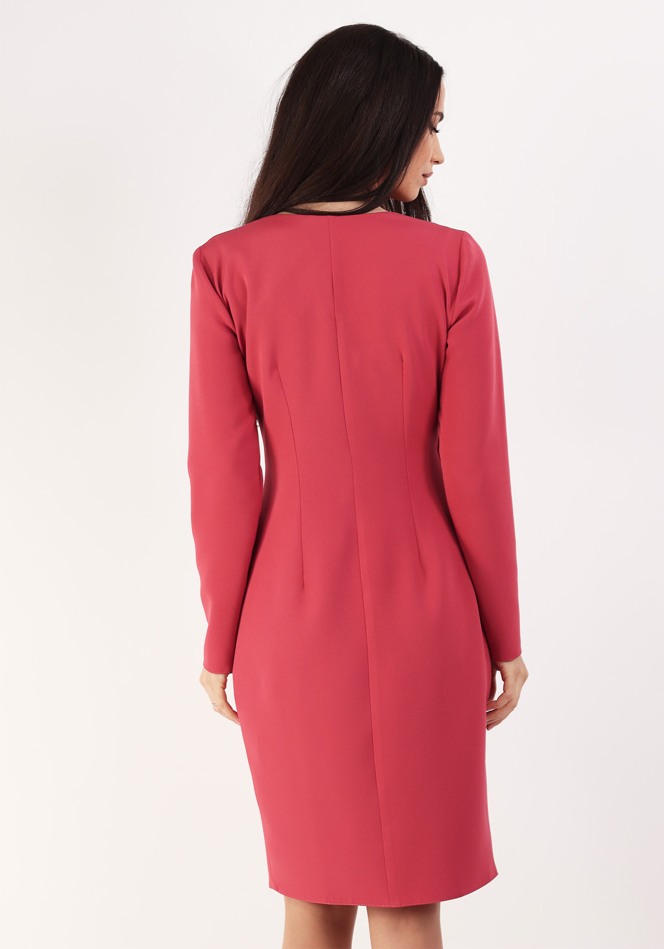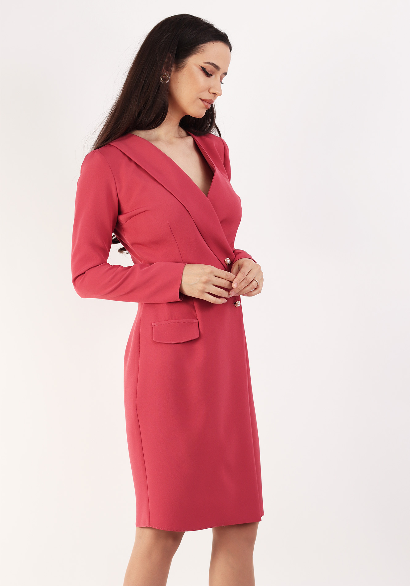 Rochie tip sacou cu rever sal pe o parte,maneca lunga,bustul cambrat,fara captusala,clapeta pe o parte,fata petrecuta,se inchide cu nasturi