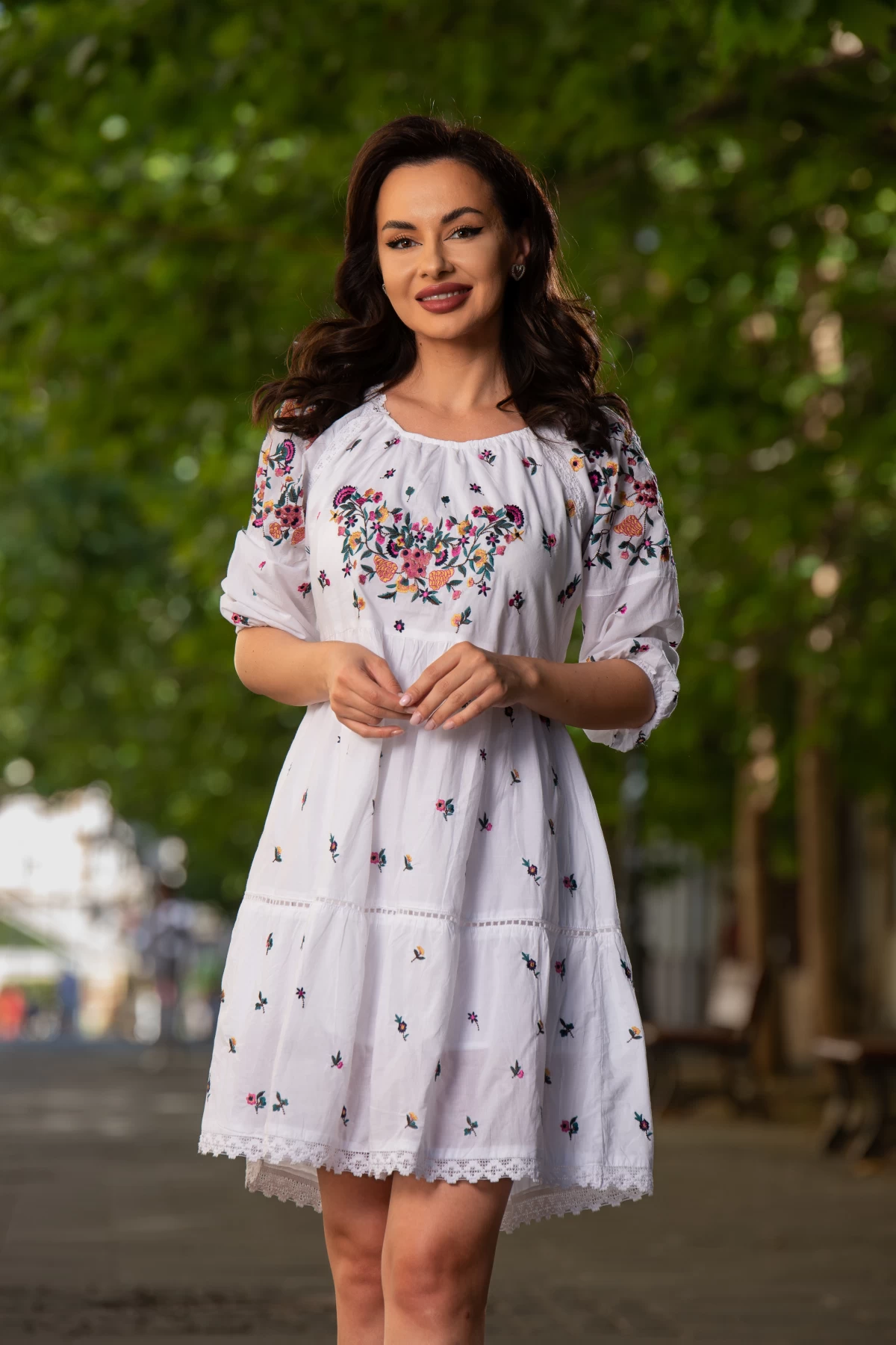 Rochie traditionala alba din bumbac Flavia in clos cu flori multicolore brodate ; Culoare: alb ; Croi: lejer ; Maneca scurta ; Brodata cu motive florale in culori vii ; Benzi aplicate cu dantela rustica din bumbac ; Decolteu rotund ; Prezinta dublura ; Fara sistem de inchidere ; Compozitie: 100% bumbac ; * Echipa noastra face toate eforturile in a prezenta cat mai bine culorile produselor prezentate pe site insa culorile pot diferi de situatia reala si pot varia în functie de setarile monitorului/dispozitivului dvs!