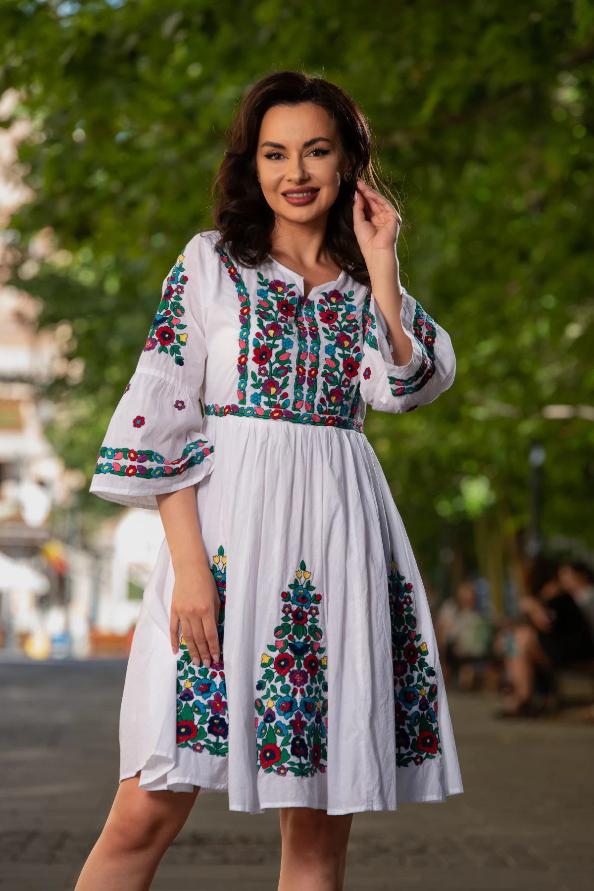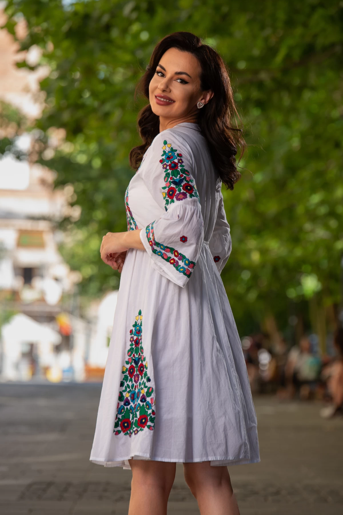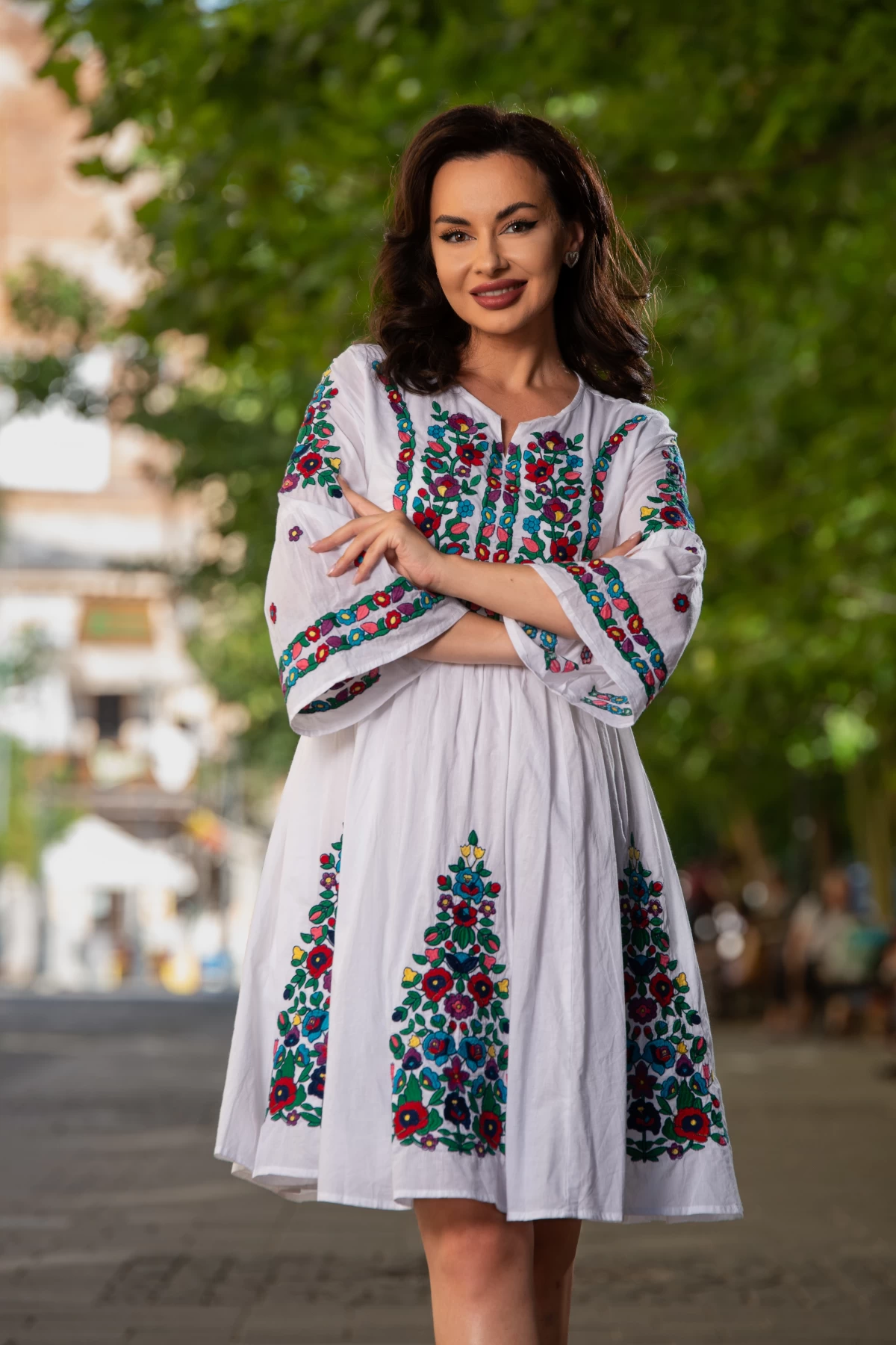 Rochie traditionala alba din bumbac Violeta cu maneca tip clopot si broderie florala ; Culoare: alb ; Croi: lejer ; Decolteu rotund ; Maneca tip clopot ; Prezinta dublura ; Broderie bogata multicolora cu motive florale ; Fara sistem de inchidere ; Compozitie: 100% poliester ; * Echipa noastra face toate eforturile in a prezenta cat mai bine culorile produselor prezentate pe site insa culorile pot diferi de situatia reala si pot varia în functie de setarile monitorului/dispozitivului dvs!